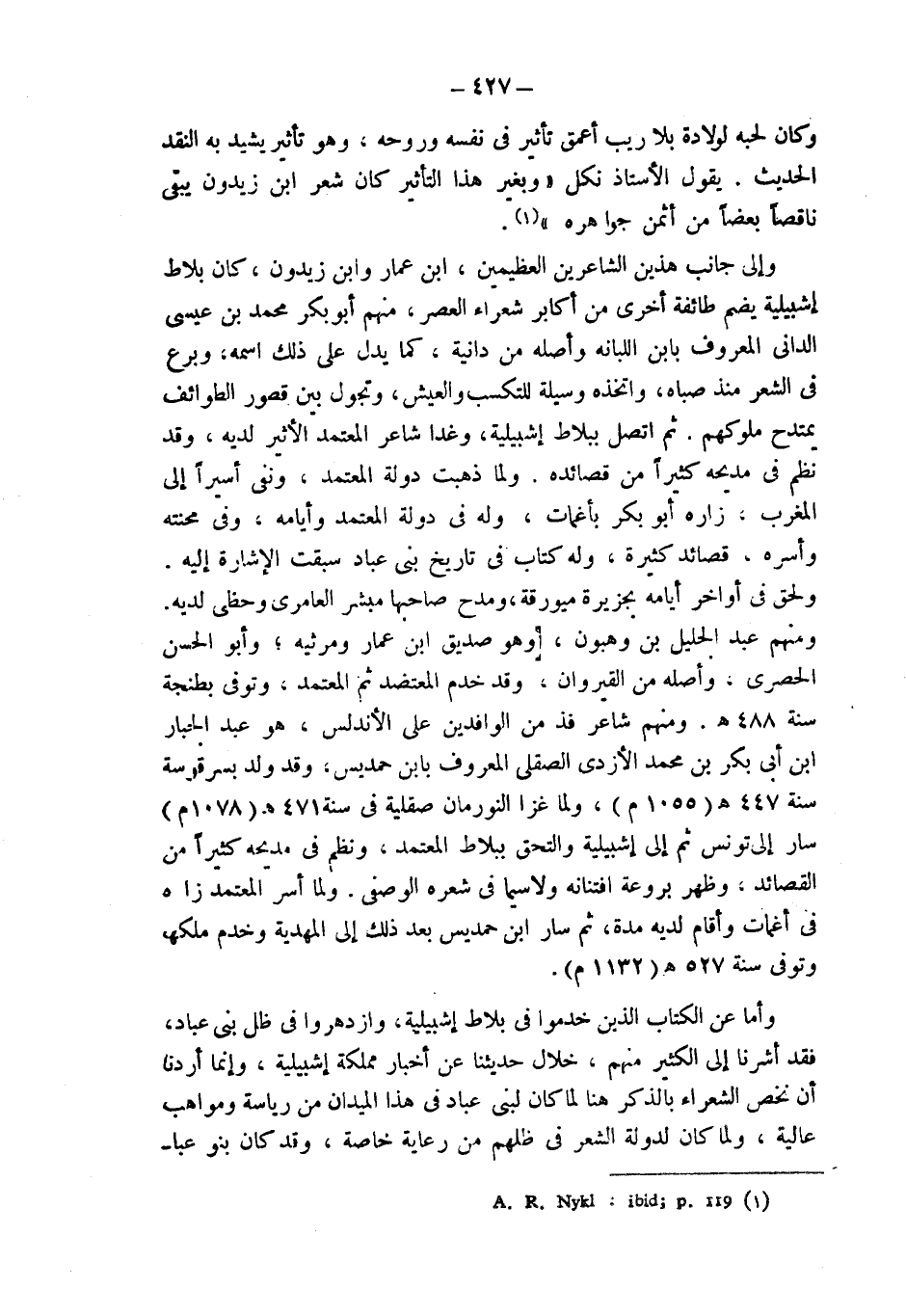 ومنهم عبد الجليل بن وهبون، وهو صديق ابن عمار ومرثيه، وأبو الحسن الحصرى، وأصله من القيروان. وقد خدم المعتضد ثم المعتمد، وتوفي بطنجة سنة 488 هـ. ومنهم شاعر فذ من الوافدين على الأندلس، هو عبد الجبار ابن أبى بكر بن محمد الأزدي الصقلي المعروف بابن حمديس، وقد ولد بسرقوسة سنة 447 هـ (1055 م)، ولما غزا النورمان صقلية في سنة 471. (1078 م) سار إلى تونس ثم إلى إشبيلية والتحق ببلاط المعتمد، ونظم في مديحه كثيراً من القصائد، وظهر بروعة افتنانه ولاسيما في شعره الوصفي. ولما أسر المعتمد زاره في أغمات وأقام لديه مدة، ثم سار ابن حمديس بعد ذلك إلى المهدية وخدم ملكها وتوفي سنة 527 هـ (1132 م).