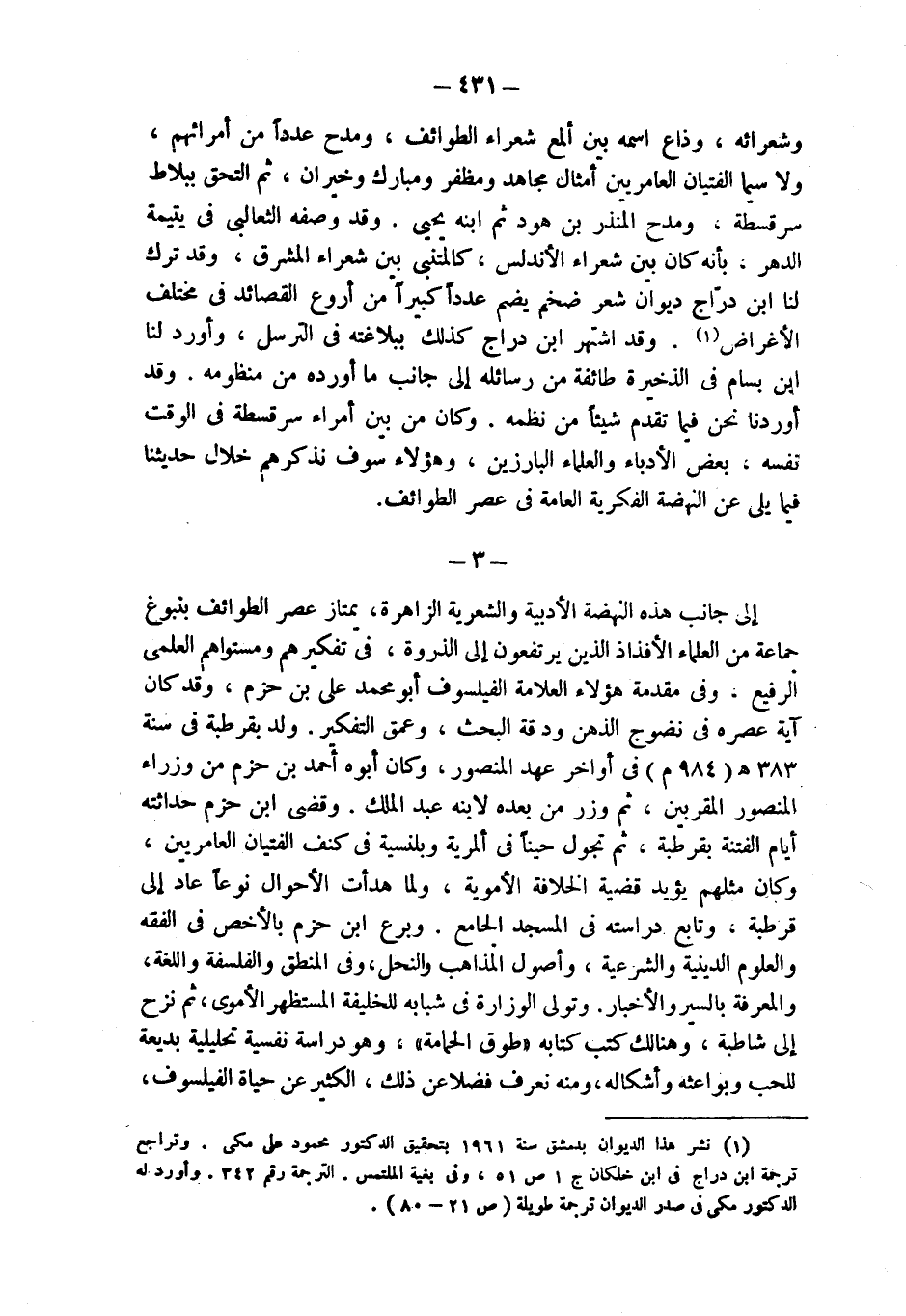 (¬1) نشر هذا الديوان بدمشق سنة 1961 بتحقيق الدكتور محمود علي مكي. وتراجع ترجمة ابن دراج في ابن خلكان ج 1 ص 51، وفي بغية الملتمس. الترجمة رقم 342. وأورد له الدكتور مكي في صدر الديوان ترجمة طويلة (ص 21 - 80).