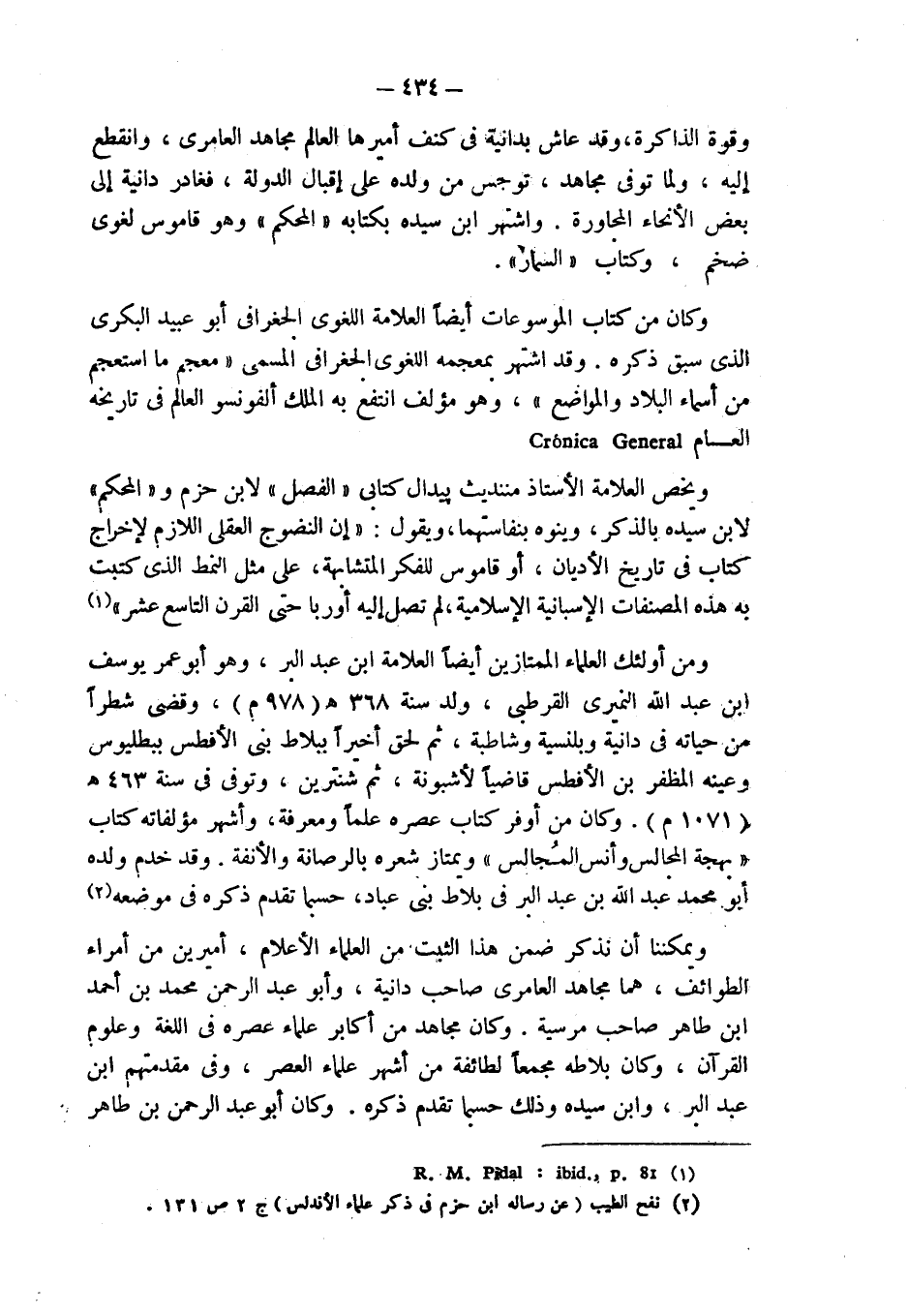 ويخص العلامة الأستاذ مننديث بيدال كتابي " الفصل " لابن حزم و " المحكم " لابن سيده بالذكر، وينوه بنفاستهما، ويقول: " إن النضوج العقلي اللازم لإخراج كتاب في تاريخ الأديان، أو قاموس للفكر المتشابهة، على مثل النمط الذي كتبت به هذه المصنفات الإسبانية الإسلامية، لم تصل إليه أوربا حتى القرن التاسع عشر " (¬1).