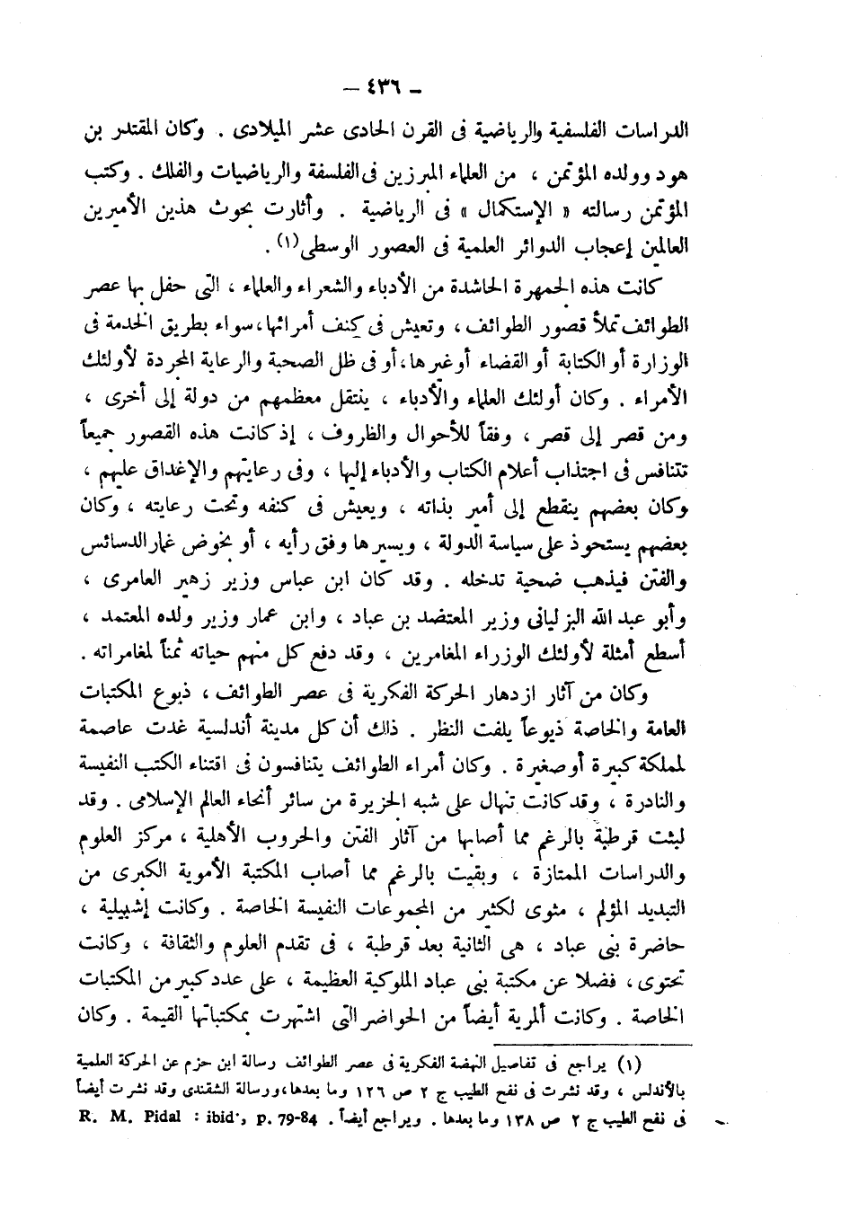 (¬1) يراجع في تفاصيل النهضة الفكرية في عصر الطوائف رسالة ابن حزم عن الحركة العلمية بالأندلس، وقد نشرت في نفح الطيب ج 2 ص 126 وما بعدها، ورسالة الشقندي وقد نشرت أيضاً في نفح الطيب ج 2 ص 138 وما بعدها. ويراجع أيضاً. R.M.Pidal: ibid ; p. 79-84