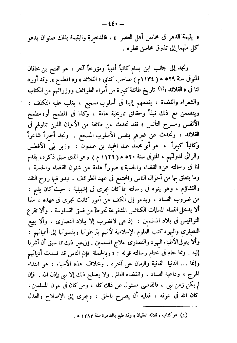 ونجد إلى جانب ابن بسام كاتباً أديباً ومؤرخاً آخر، هو الفتح بن خاقان المتوفى سنة 529 هـ (1134 م) صاحب كتابي " القلائد " و " المطمح ". وقد أورد لنا في " القلائد " (¬1) تاريخ طائفة كبيرة من أمراء الطوائف ووزرائهم من الكتاب والشعراء والقضاة، يقدمهم إلينا في أسلوب مسجع، يغلب عليه التكلف، ويتضمن مع ذلك نبذاً وحقائق تاريخية هامة، وكذا في المطمح أو " مطمح الأنفس ومسرح التأنس " فقد تحدث عن طائفة من الأعيان الذين تناولهم في القلائد، وتحدث عن غيرهم بنفس الأسلوب المسجع. ونجد أخيراً شاعراً وكاتباً كبيراً، هو أبو محمد عبد المجيد بن عبدون، وزير بني الأفطس والراثي لدولتهم، المتوفى سنة 520 هـ (1126 م) وهو الذي سبق ذكره، يقدم لنا في رسالته عن " القضاء والحسبة " صوراً هامة عن شئون القضاء والحسبة، وما يتعلق بها من أحوال الناس والمجتمع في عهد الطوائف، تبدو فيها روح النقد والتشاؤم، وهو ينوه في رسالته بما كان يجرى في إشبيلية، حيث كان يقيم، من ضروب الفساد، ويدعو إلى الكف عن أمور كانت تجرى في عهده، منها ألا يدخل النساء المسلمات الكنائس المشفوعة تحوطاً من فسق القساوسة، وألا تقرع النواقيس في بلاد المسلمين، إذ هي لا تضرب إلا ببلاد النصارى، وألا يبيع النصارى واليهود كتب العلوم الإسلامية لأنهم يترجمونها وينسبونها إلى أعيانهم، وألا يتولى الأطباء اليهود والنصارى علاج المسلمين. إلى غير ذلك مما سبق أن أشرنا إليه. ومما جاء في ختام رسالته قوله: " وبالجملة فإن الناس قد فسدت أديانهم وإنما ... الدنيا الفانية والزمان على آخره. وخلاف هذه الأشياء، هو ابتداء الهرج، وداعية الفساد، وانقضاء العالم. ولا يصلح ذلك إلا نبي بإذن الله. فإن لم يكن زمن نبي، فالقاضي مسؤول عن ذلك كله، ومن كان في عون المسلمين، كان الله في عونه، فعليه أن يصرح بالحق، ويجري إلى الإصلاح والعدل