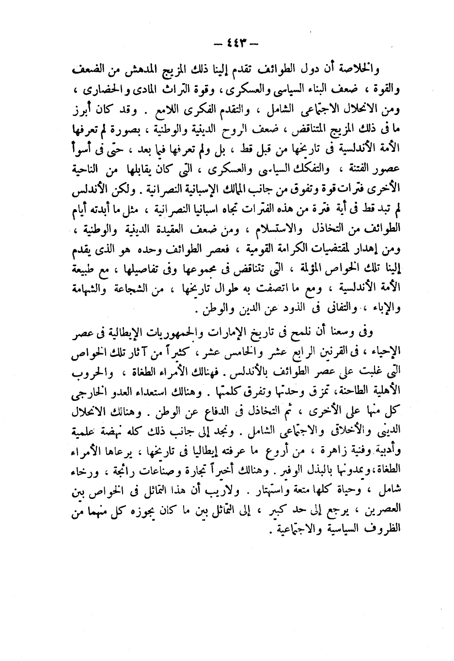 وفي وسعنا أن نلمح في تاريخ الإمارات والجمهوريات الإيطالية في عصر الإحياء، في القرنين الرابع عشر والخامس عشر، كثيراً من آثار تلك الخواص التي غلبت على عصر الطوائف بالأندلس. فهنالك الأمراء الطغاة، والحروب الأهلية الطاحنة، تمزق وحدتها وتفرق كلمتها. وهنالك استعداء العدو الخارجي كل منها على الأخرى، ثم التخاذل في الدفاع عن الوطن. وهنالك الانحلال الديني والأخلاقي والاجتماعي الشامل. ونجد إلى جانب ذلك كله نهضة علمية وأدبية. وفنية زاهرة، من أروع ما عرفته إيطاليا في تاريخها، يرعاها الأمراء الطغاة، ويمدونها بالبذل الوفير. وهنالك أخيراً تجارة وصناعات رائجة. ورخاء شامل، وحياة كلها متعة واستهتار. ولا ريب أن هذا التماثل في الخواص بين العصرين، يرجع إلى حد كبير، إلى التماثل بين ما كان يجوزه كل منهما من الظروف السياسية والاجتماعية.