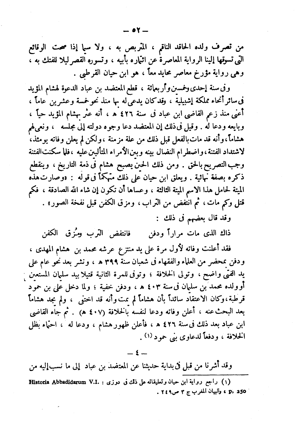 (¬1) راجع رواية ابن حيان وتعليقاته على ذلك في دوزي: Historia Abbadidarum V.I.p, 250 , والبيان المغرب ج 3 ص 249.