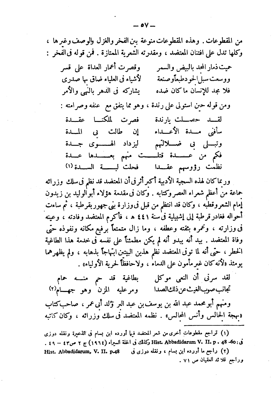 (¬1) تراجع مقطوعات أخرى من شعر المعتضد فيما أورده ابن بسام في الذخيرة ونقله دوزي في: Hist. Abbadidarum V.II.p. 48-60. وكذلك في الحلة السيراء (1964) ج 2 ص 43 - 49.