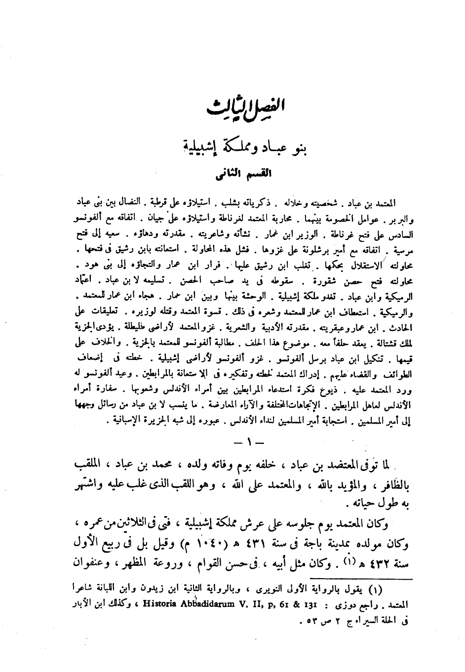 المعتمد بن عباد. شخصيته وخلاله. ذكرياته بشلب. استيلاؤه على قرطبة. النضال بين بني عباد والبربر. عوامل الخصومة بينهما. محاربة المعتمد لغرناطة واستيلاؤه على جيان. اتفاقه مع ألفونسو السادس على فتح غرناطة. الوزير ابن عمار. نشأته وشاعريته. مقدرته ودهاؤه. سعيه إلى فتح مرسية. اتفاقه مع أمير برشلونة على غزوها. فشل هذه المحاولة. استعانته بابن رشيق في فتحها. محاولته الاستقلال بحكمها. تغلب ابن رشيق عليها. فرار ابن عمار والتجاؤه إلى بني هود. محاولته فتح حصن شقورة. سقوطه في يد صاحب الحصن. تسليمه لابن عباد. اعتماد الرميكية وابن عباد. تغدو ملكة إشبيلية. الوحشة بينها وبين ابن عمار. هجاء ابن عمار للمعتمد. والرميكية. استعطاف ابن عمار للمعتمد وشعره في ذلك. قسوة المعتمد وقتله لوزيره. تعليقات على الحادث. ابن عمار وعبقريته. مقدرته الأدبية والنثرية. غزو المعتمد لأراضي طليطلة. يؤدي الجزية لملك قشتالة. يعقد حلفاً معه. موضوع هذا الحلف. مطالبة ألفونسو للمعتمد بالجزية. والخلاف على قيمتها. تنكيل ابن عباد برسل ألفونسو. غزو ألفونسو لأراضي إشبيلية. خطته في إضعاف الطوائف والقضاء عليهم. إدراك المعتمد لخطته وتفكيره في الاستعانة بالمرابطين. وعيد ألفونسو له ورد المعتمد عليه. ذيوع فكرة استدعاء المرابطين بين أمراء الأندلس وشعوبها. سفارة أمراء الأندلس لعاهل المرابطين. الإتجاهات المختلفة والآراء المعارضة. ما ينسب لابن عباد من رسائل وجهها إلى أمير المسلمين. استجابة أمير المسلمين لنداء الأندلس. عبوره إلى شبه الجزيرة الإسبانية.