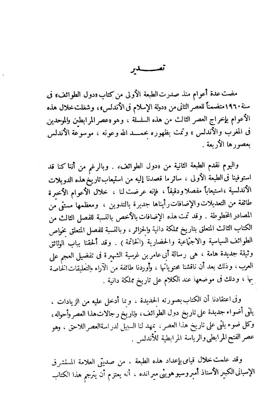 واليوم نقدم الطبعة الثانية من "دول الطوائف". وبالرغم من أننا كنا قد استوفينا في الطبعة الأولى، سائر ما قصدنا إليه من استيعاب تاريخ هذه الدويلات الأندلسية، استيعاباً مفصلا ودقيقاً، فإنه عرضت لنا، خلال الأعوام الأخيرة طائفة من التعديلات والإضافات رأيناها جديرة بالتدوين، ومعظمها مستقى من المصادر المخطوطة. وقد تمت هذه الإضافات بالأخص بالنسبة للفصل الثالث من الكتاب الثالث المتعلق بتاريخ مملكة دانية والجزائر، وبالنسبة للفصل المتعلق بخواص الطوائف السياسية والاجتماعية والحضارية (الخاتمة). وقد ألحقنا بباب الوثائق وثيقة جديدة هامة، هي رسالة أبي عامر بن غرسية الشهيرة في تفضيل العجم على العرب، وذلك بعد أن ناقشنا محتوياتها، وأوردنا طائفة من الآراء والتعليقات الخاصة بها، وذلك في موضعها عند الكلام على تاريخ مملكة دانية.