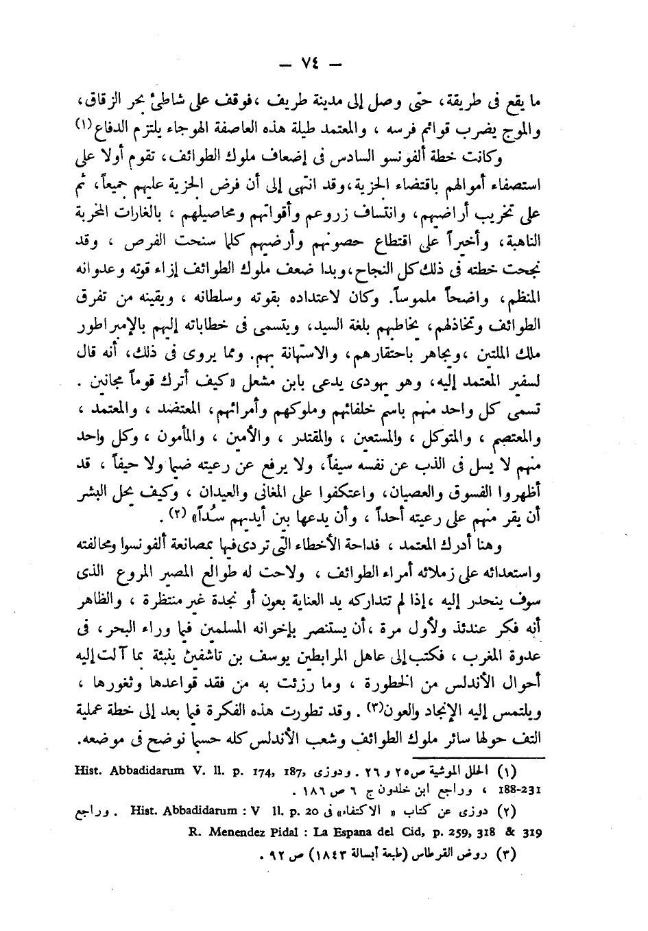 (¬1) الحلل الموشية ص 25 و 26. ودوزي Hist.Abbadidarum V. II. p. 174, 187, 188-231. وراجع ابن خلدون ج 6 ص 186.