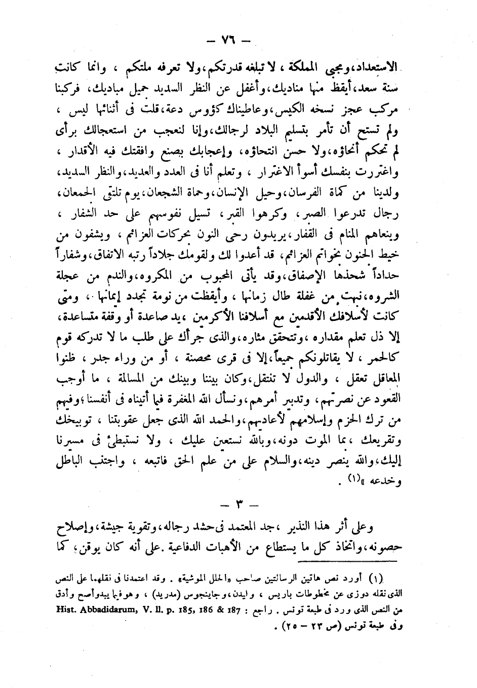 (¬1) أورد نص هاتين الرسالتين صاحب "الحلل الموشية". وقد اعتمدنا في نقلهما على النص الذي نقله دوزي عن مخطوطات باريس، وليدن، وجاينجوس (مدريد)، وهو فيما يبدو أصح وأدق من النص الذي ورد في طبعة تونس. راجع: Hist. Abbadidarum, V. II. p. 185, 186 & 187 وفي طبعة تونس (ص 23 - 25).