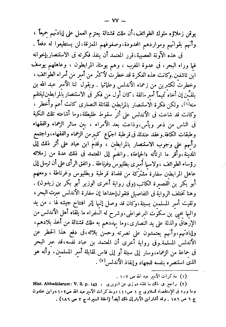 (¬2) راجع في ذلك ما نقله دوزي عن النويرى: Hist. Abbadidarum: V. II. p. 143. وما ورد في الإستقصاء للسلاوي ج 1 ص 111، ومذكرات الأمير عبد الله ص 102، وابن خلدون ج 6 ص 186. وقد أشار ابن الأبار إلى ذلك أيضاً (الحلة السيراء ج 2 ص 186).