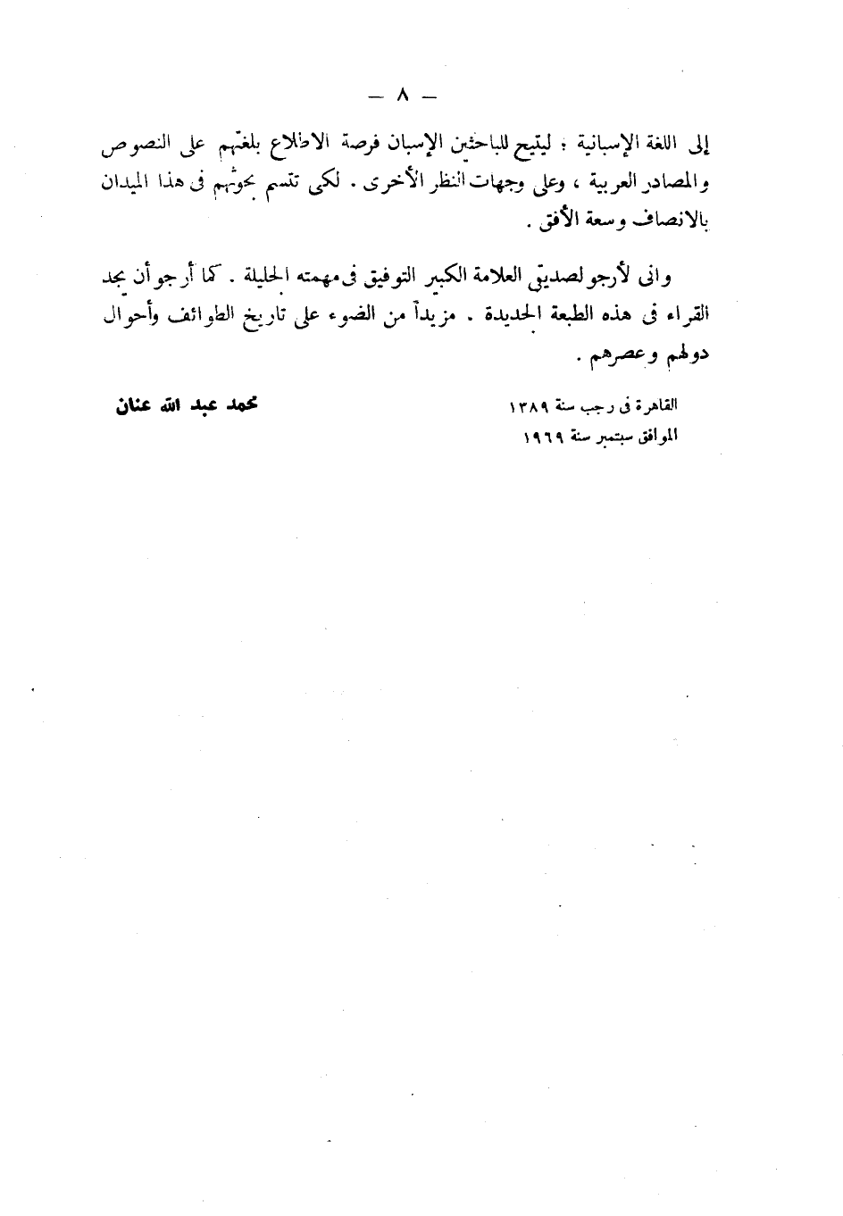 واني لأرجو لصديقي العلامة الكبير التوفيق في مهمته الجليلة. كما أرجو أن يجد القراء في هذه الطبعة الجديدة، مزيداً من الضوء على تاريخ الطوائف وأحوال دولهم وعصرهم.