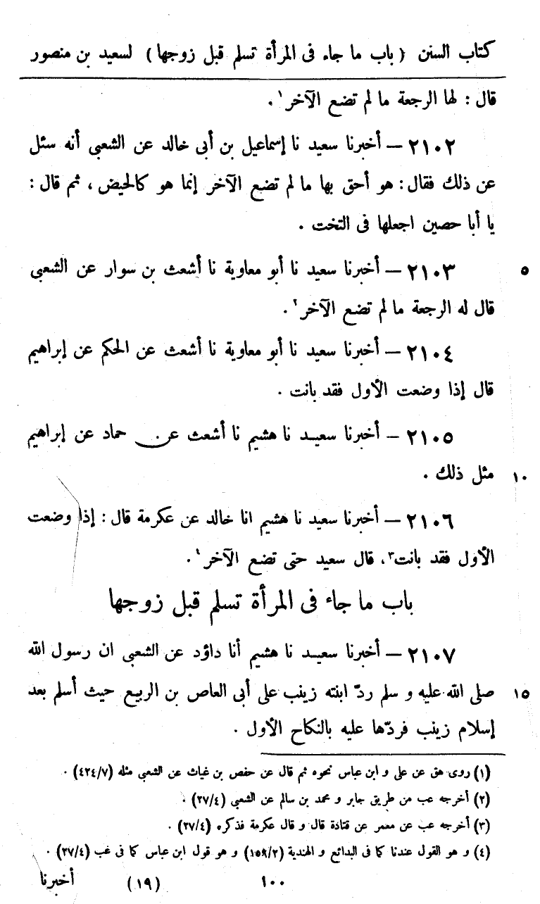 2107 - أَخْبَرَنَا سَعِيدٌ، نا هُشَيْمٌ، أنا دَاوُدُ، عَنِ الشَّعْبِيِّ، أَنَّ رَسُولَ اللَّهِ صَلَّى اللهُ عَلَيْهِ وَسَلَّمَ §رَدَّ ابْنَتَهُ زَيْنَبَ عَلَى أَبِي الْعَاصِ بْنِ الرَّبِيعِ حَيْثُ أَسْلَمَ بَعْدَ إِسْلَامِ زَيْنَبَ، فَرَدَّهَا عَلَيْهِ بِالنِّكَاحِ الْأَوَّلِ