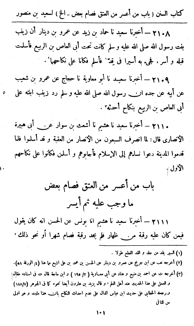 2108 - أَخْبَرَنَا سَعِيدٌ، نا حَمَّادُ بْنُ زَيْدٍ، عَنْ عَمْرِو بْنِ دِينَارٍ أَنَّ §زَيْنَبَ بِنْتَ رَسُولِ اللَّهِ، صَلَّى اللهُ عَلَيْهِ وَسَلَّمَ كَانَتْ تَحْتَ أَبِي الْعَاصِ بْنِ الرَّبِيعِ فَأَسْلَمَتْ قَبْلَهُ وَأُسِرَ، فَجِيءَ بِهِ أَسِيرًا فِي قَيْدٍ فَأَسْلَمَ «فَكَانَا عَلَى نِكَاحِهِمَا»