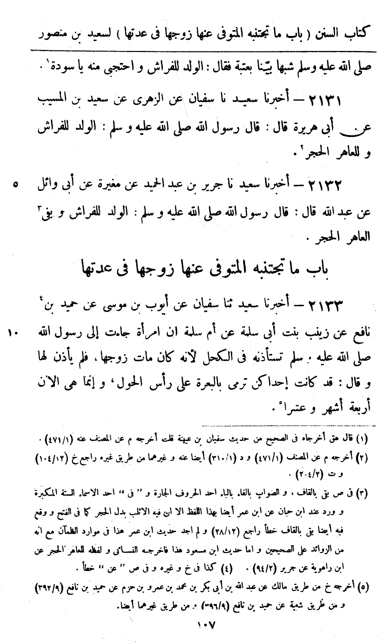 2132 - أَخْبَرَنَا سَعِيدٌ، نا جَرِيرُ بْنُ عَبْدِ الْحَمِيدِ، عَنْ مُغِيرَةَ، عَنْ أَبِي وَائِلٍ، عَنْ عَبْدِ اللَّهِ، قَالَ: قَالَ رَسُولُ اللَّهِ صَلَّى اللهُ عَلَيْهِ وَسَلَّمَ: «§الْوَلَدُ لِلْفِرَاشِ وَبِفِي الْعَاهِرِ الْحَجَرُ»