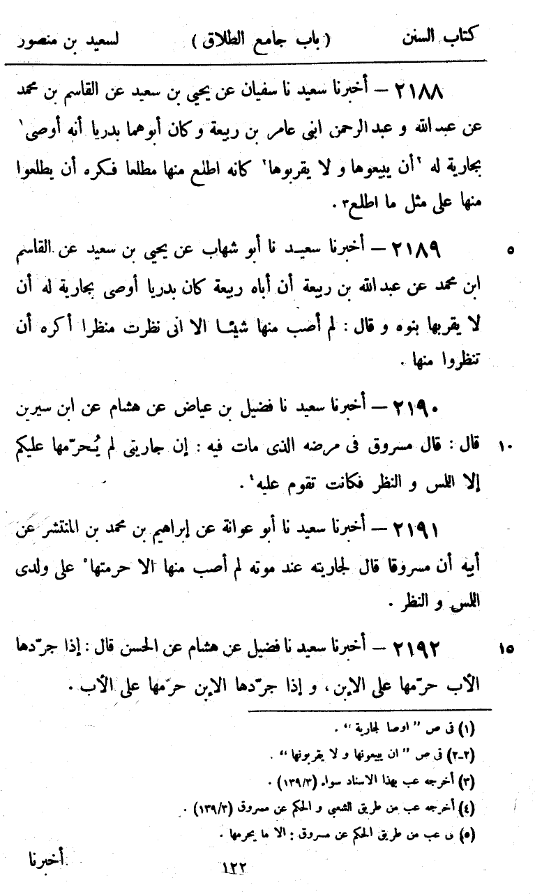 2191 - أَخْبَرَنَا سَعِيدٌ، نا أَبُو عَوَانَةَ، عَنْ إِبْرَاهِيمَ بْنِ مُحَمَّدِ بْنِ الْمُنْتَشِرِ، عَنْ أَبِيهِ، أَنَّ مَسْرُوقًا، قَالَ لِجَارِيَتِهِ عِنْدَ مَوْتِهِ: «§لَمْ أُصِبْ مِنْهَا إِلَّا حَرَّمْتُهَا عَلَى وَلَدِي اللَّمْسَ وَالنَّظَرَ»