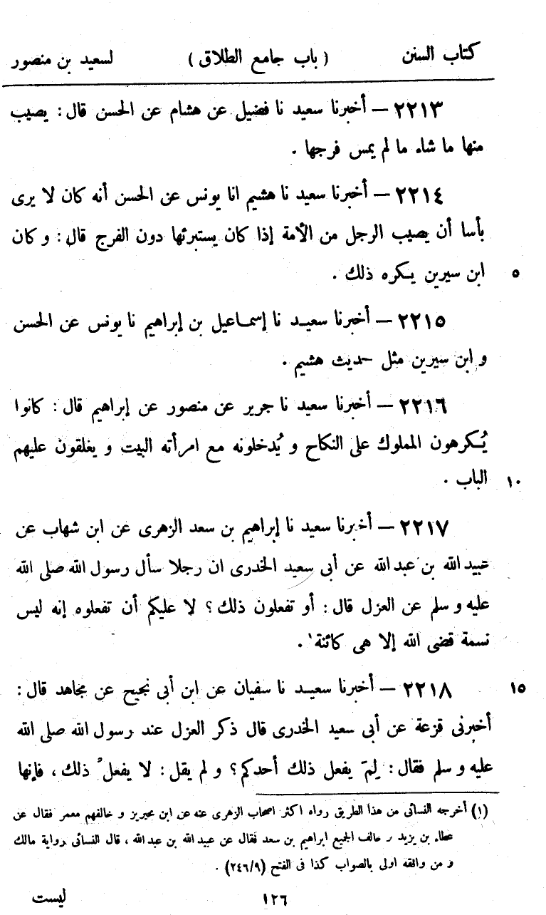 2214 - أَخْبَرَنَا سَعِيدٌ، نا هُشَيْمٌ، أنا يُونُسُ، عَنِ الْحَسَنِ أَنَّهُ كَانَ «§لَا يَرَى بَأْسًا أَنْ يُصِيبَ الرَّجُلُ مِنَ الْأَمَةِ إِذَا كَانَ يَسْتَبْرِئُهَا دُونَ الْفَرْجِ» قَالَ: وَكَانَ ابْنُ سِيرِينَ يَكْرَهُ ذَلِكَ،