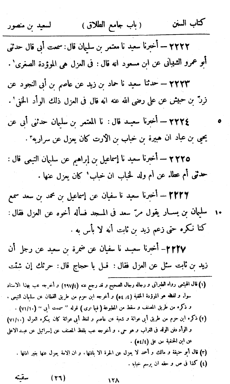 2222 - أَخْبَرَنَا سَعِيدٌ، نا مُعْتَمِرُ بْنُ سُلَيْمَانَ، قَالَ: سَمِعْتُ أَبِي قَالَ: حَدَّثَنِي أَبُو عَمْرٍو الشَّيْبَانِيُّ، عَنِ ابْنِ مَسْعُودٍ، أَنَّهُ قَالَ فِي §الْعَزْلِ: «هِيَ الْمَوْءُودَةُ الصُّغْرَى»