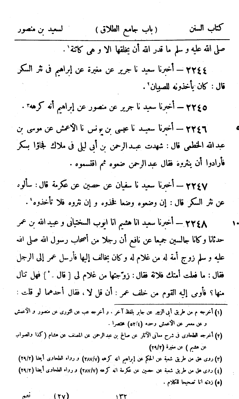 2245 - أَخْبَرَنَا سَعِيدٌ، نا جَرِيرٌ، عَنْ مُغِيرَةَ، عَنْ إِبْرَاهِيمَ، فِي §نَثْرِ السُّكَّرِ قَالَ: «كَانَ يَأْخُذُونَهُ لِلصِّبْيَانِ» أَخْبَرَنَا سَعِيدٌ، نا جَرِيرٌ، عَنْ مَنْصُورٍ، عَنْ إِبْرَاهِيمَ، أَنَّهُ كَرِهَهُ