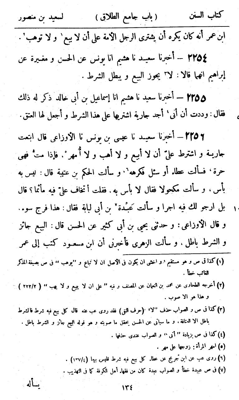 2256 - أَخْبَرَنَا سَعِيدٌ، نا عِيسَى بْنُ يُونُسَ، نا الْأَوْزَاعِيُّ، قَالَ: " ابْتَعْتُ جَارِيَةً وَاشْتُرِطَ عَلَيَّ أَنْ لَا أَبِيعَ وَلَا أَهَبَ وَلَا أُمْهِرَ، فَإِذَا مُتُّ فَهِيَ حُرَّةٌ، فَسَأَلْتُ عَطَاءً - أَوْ سُئِلَ - فَكَرِهَهُ، وَسَأَلْتُ الْحَكَمَ بْنَ عُتَيْبَةَ قَالَ: لَيْسَ بِهِ بَأْسٌ، وَسَأَلْتُ مَكْحُولًا، فَقَالَ: لَا بَأْسَ بِهِ، فَقُلْتُ: أَتَخَافُ عَلَيَّ فِيهِ مَأْثَمًا؟ قَالَ: بَلْ أَرْجُو لَكَ فِيهِ أَجْرًا، وَسَأَلْتُ عَبْدَةَ بْنَ أَبِي لُبَابَةَ، فَقَالَ: هَذَا فَرْجُ سُوءٍ، وَقَالَ الْأَوْزَاعِيُّ: وَحَدَّثَنِي يَحْيَى بْنُ أَبِي كَثِيرٍ عَنِ الْحَسَنِ قَالَ: الْبَيْعُ جَائِزٌ وَالشَّرْطُ بَاطِلٌ، وَسَأَلْتُ الزُّهْرِيَّ، فَأَخْبَرَنِي أَنَّ ابْنَ مَسْعُودٍ كَتَبَ إِلَى عُمَرَ -[135]- يَسْأَلُهُ عَنِ ابْتِيَاعِهِ مِنِ امْرَأَتِهِ جَارِيَةً عَلَى إِنْ بَاعَهَا فَهِيَ أَحَقُّ بِهَا بِالثَّمَنِ، فَقَالَ عُمَرُ: «§لَا تَطَأْ فَرْجًا وَفِيهِ شَرْطٌ لِغَيْرِكَ»