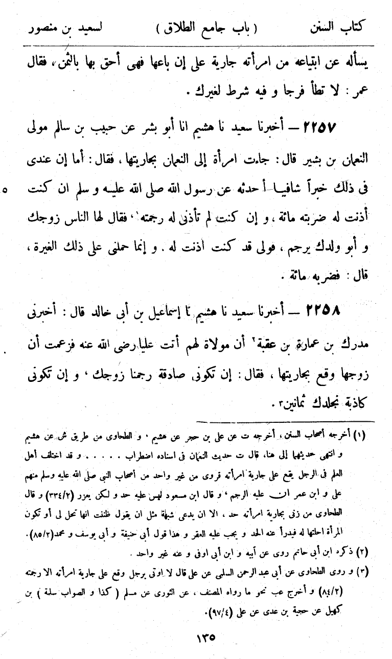 2257 - أَخْبَرَنَا سَعِيدٌ، نا هُشَيْمٌ، أنا أَبُو بِشْرٍ، عَنْ حَبِيبِ بْنِ سَالِمٍ، مَوْلَى النُّعْمَانِ بْنِ بَشِيرٍ قَالَ: جَاءَتِ امْرَأَةٌ إِلَى النُّعْمَانِ بِجَارِيَتِهَا، فَقَالَ: أَمَا إِنَّ عِنْدِي فِي ذَلِكَ خَبَرًا شَافِيًا أُحَدِّثُهُ عَنْ رَسُولِ اللَّهِ صَلَّى اللهُ عَلَيْهِ وَسَلَّمَ: «§إِنْ كُنْتِ أَذِنْتِ لَهُ ضَرَبْتُهُ مِائَةً، وَإِنْ كُنْتِ لَمْ تَأْذَنِي لَهُ رَجَمْتُهُ» فَقَالَ لَهَا النَّاسُ: زَوْجُكِ وَأَبُو وَلَدِكِ يُرْجَمُ قُولِي: قَدْ كُنْتُ أَذِنْتُ لَهُ، وَإِنَّمَا حَمَلَنِي عَلَى ذَلِكَ الْغَيْرَةُ قَالَ: فَضَرَبَهُ مِائَةً