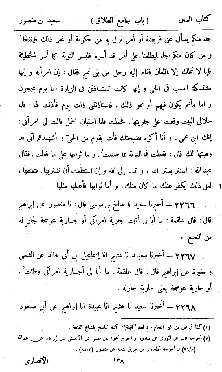 2267 - أَخْبَرَنَا سَعِيدٌ، نا هُشَيْمٌ، أنا إِسْمَاعِيلُ بْنُ أَبِي خَالِدٍ، عَنِ الشَّعْبِيِّ، وَمُغِيرَةَ، عَنْ إِبْرَاهِيمَ، قَالَ: قَالَ عَلْقَمَةُ: «مَا أُبَالِي أَجَارِيَةُ امْرَأَتِي وَطِئْتُ، أَوْ جَارِيَةُ عَوْسَجَةَ» يَعْنِي جَارِيَةَ جَارٍ لَهُ