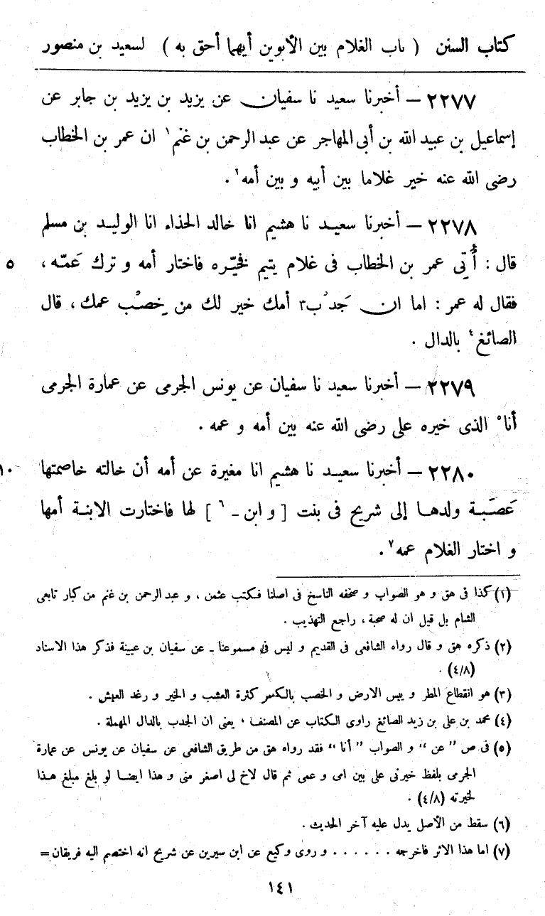 أَخْبَرَنَا سَعِيدٌ، نا هُشَيْمٌ، أنا خَالِدٌ الْحَذَّاءُ، أنا الْوَلِيدُ بْنُ مُسْلِمٍ، قَالَ: أُتِيَ عُمَرُ بْنُ الْخَطَّابِ فِي §غُلَامٍ يَتِيمٍ، فَخَيَّرَهُ فَاخْتَارَ أُمَّهُ، وَتَرَكَ عَمَّهُ، فَقَالَ لَهُ عُمَرُ: «أَمَا إِنَّ جَدْبَ أُمِّكَ خَيْرٌ لَكَ مِنْ خِصْبِ عَمِّكَ» قَالَ الصَّائِغُ بِالدَّالِ