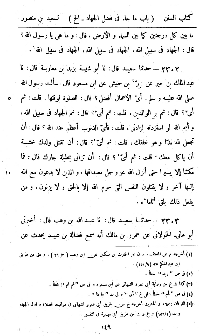 2302 - حَدَّثَنَا سَعِيدٌ قَالَ: نا أَبُو شَيْبَةَ يَزِيدُ بْنُ مُعَاوِيَةَ، قَالَ: نا عَبْدُ الْمَلِكِ بْنُ عُمَيْرٍ، عَنْ زِرِّ بْنِ حُبَيْشٍ، عَنِ ابْنِ مَسْعُودٍ قَالَ: سَأَلْتُ رَسُولَ اللَّهِ صَلَّى اللهُ عَلَيْهِ وَسَلَّمَ، أَيُّ الْأَعْمَالِ أَفْضَلُ؟ قَالَ: «§الصَّلَاةُ لِوَقْتِهَا» قُلْتُ: ثُمَّ أَيُّ؟ قَالَ: «ثُمَّ بِرُّ الْوَالِدَيْنِ» قُلْتُ: ثُمَّ أَيُّ؟ قَالَ: «ثُمَّ الْجِهَادُ فِي سَبِيلِ اللَّهِ» وَايْمُ اللَّهِ لَوِ اسْتَزَدْتُهُ لَزَادَنِي