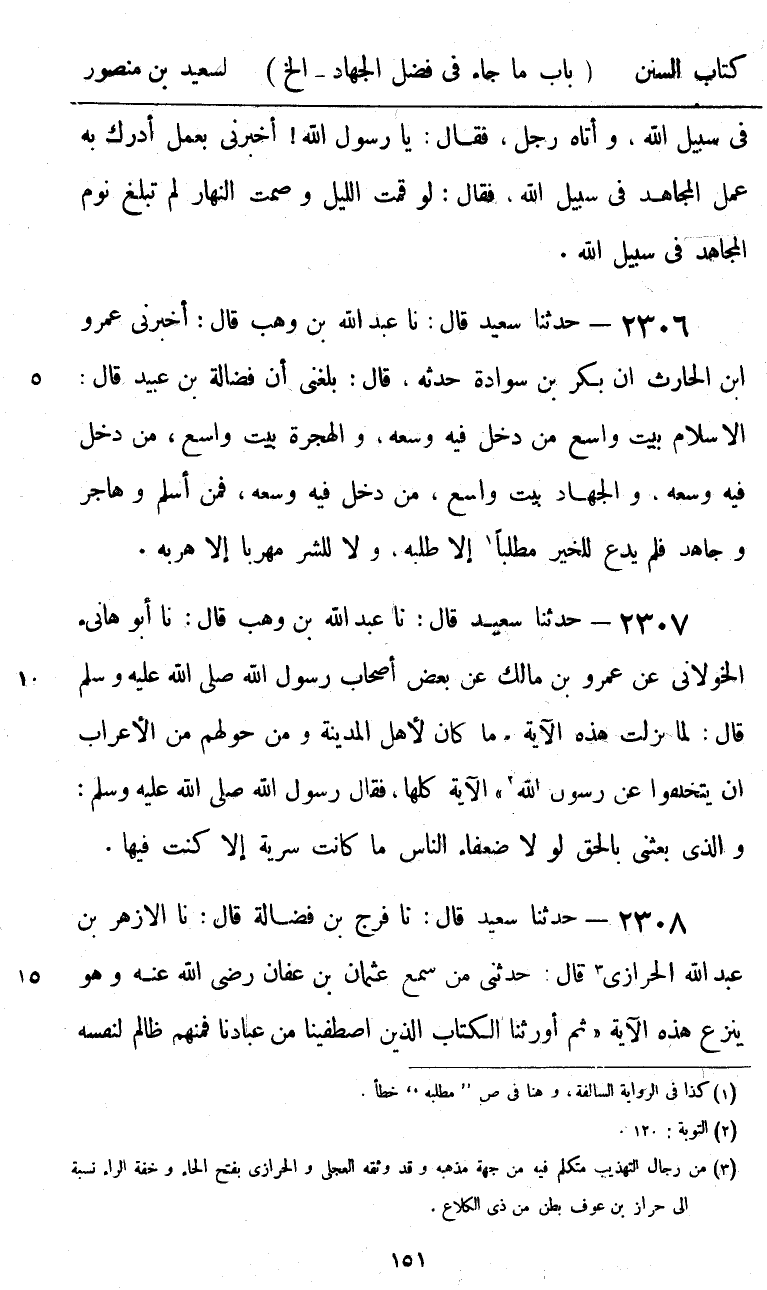 2307 - حَدَّثَنَا سَعِيدٌ قَالَ: نا عَبْدُ اللَّهِ بْنُ وَهْبٍ، قَالَ: نا أَبُو هَانِئٍ الْخَوْلَانِيُّ، عَنْ عَمْرِو بْنِ مَالِكٍ، عَنْ بَعْضِ أَصْحَابِ رَسُولِ اللَّهِ صَلَّى اللهُ عَلَيْهِ وَسَلَّمَ قَالَ: لَمَّا نَزَلَتْ هَذِهِ الْآيَةُ {مَا كَانَ لِأَهْلِ الْمَدِينَةِ وَمَنْ حَوْلَهُمْ مِنَ الْأَعْرَابِ أَنْ يَتَخَلَّفُوا عَنْ رَسُولِ اللَّهِ} [التوبة: 120] الْآيَةَ كُلَّهَا، فَقَالَ رَسُولُ اللَّهِ صَلَّى اللهُ عَلَيْهِ وَسَلَّمَ: «وَالَّذِي بَعَثَنِي بِالْحَقِّ §لَوْلَا ضُعَفَاءُ النَّاسِ مَا كَانَتْ سَرِيَّةٌ إِلَّا كُنْتُ فِيهَا»