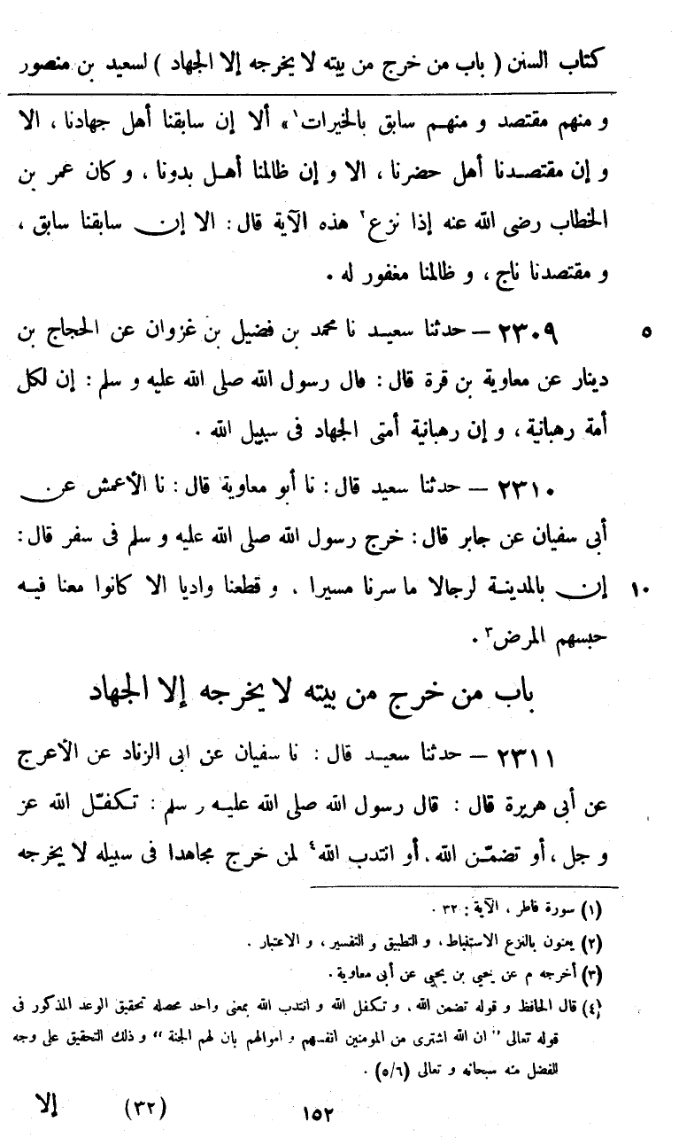 2311 - حَدَّثَنَا سَعِيدٌ قَالَ: نا سُفْيَانُ، عَنْ أَبِي الزِّنَادِ، عَنِ الْأَعْرَجِ، عَنْ أَبِي هُرَيْرَةَ، قَالَ: قَالَ رَسُولُ اللَّهِ صَلَّى اللهُ عَلَيْهِ وَسَلَّمَ: «تَكَفَّلَ اللَّهُ عَزَّ وَجَلَّ، أَوْ تَضَمَّنَ اللَّهُ، أَوِ §انْتَدَبَ اللَّهُ لِمَنْ خَرَجَ مُجَاهِدًا فِي سَبِيلِهِ لَا يُخْرِجُهُ -[153]- إِلَّا الْجِهَادُ، وَالْإِيمَانُ بِاللَّهِ وَرَسُولِهِ، وَتَصْدِيقًا بِهِ إِنْ تَوَفَّاهُ أَنْ يُدْخِلَهُ الْجَنَّةَ أَوْ يَرُدَّهُ إِلَى بَيْتِهِ الَّذِي خَرَجَ مِنْهُ نَائِلًا مَا نَالَ مِنْ أَجْرٍ أَوْ غَنِيمَةٍ»