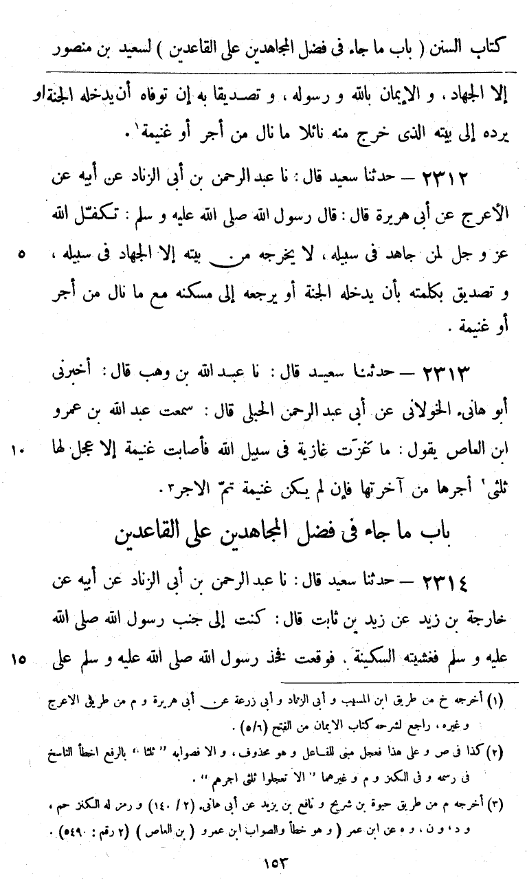 2312 - حَدَّثَنَا سَعِيدٌ قَالَ: نا عَبْدُ الرَّحْمَنِ بْنُ أَبِي الزِّنَادِ، عَنْ أَبِيهِ، عَنِ الْأَعْرَجِ، عَنْ أَبِي هُرَيْرَةَ، قَالَ: قَالَ رَسُولُ اللَّهِ صَلَّى اللهُ عَلَيْهِ وَسَلَّمَ: «§تَكَفَّلَ اللَّهُ عَزَّ وَجَلَّ لِمَنْ جَاهَدَ فِي سَبِيلِهِ، لَا يُخْرِجُهُ مِنْ بَيْتِهِ إِلَّا الْجِهَادُ فِي سَبِيلِهِ، وَتَصْدِيقٌ بِكَلِمَتِهِ بِأَنْ يُدْخِلَهُ الْجَنَّةَ أَوْ يَرْجِعَهُ إِلَى مَسْكَنِهِ مَعَ مَا نَالَ مِنْ أَجْرٍ أَوْ غَنِيمَةٍ»