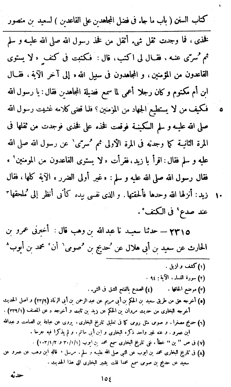 2315 - حَدَّثَنَا سَعِيدٌ قَالَ: نا عَبْدُ اللَّهِ بْنُ وَهْبٍ، قَالَ: أَخْبَرَنِي عَمْرُو بْنُ الْحَارِثِ، عَنْ سَعِيدِ بْنِ أَبِي هِلَالٍ، عَنْ حُدَيْجِ بْنِ صُومِيٍّ، أَنَّ مُحَمَّدَ بْنَ أَيُّوبَ -[155]- حَدَّثَهُ، أَنَّ §رَجُلَيْنِ عَلَى عَهْدِ رَسُولِ اللَّهِ صَلَّى اللهُ عَلَيْهِ وَسَلَّمَ شَرِيكَيْنِ فِي الْعَمَلِ يَقُولُ: عَمَلُهُمَا كَادَ أَنْ يَكُونَ سَوَاءً، فَغَزَا وَاحِدٌ وَقَعَدَ الْآخَرُ، فَسَأَلَ الْقَاعِدُ رَسُولَ اللَّهِ صَلَّى اللهُ عَلَيْهِ وَسَلَّمَ: كَمْ فَضْلُ الْمُجَاهِدِ فِي سَبِيلِ اللَّهِ عَلَى الْقَاعِدِ؟ قَالَ رَسُولُ اللَّهِ صَلَّى اللهُ عَلَيْهِ وَسَلَّمَ: «مِائَةُ دَرَجَةٍ فِي الْجَنَّةِ»
