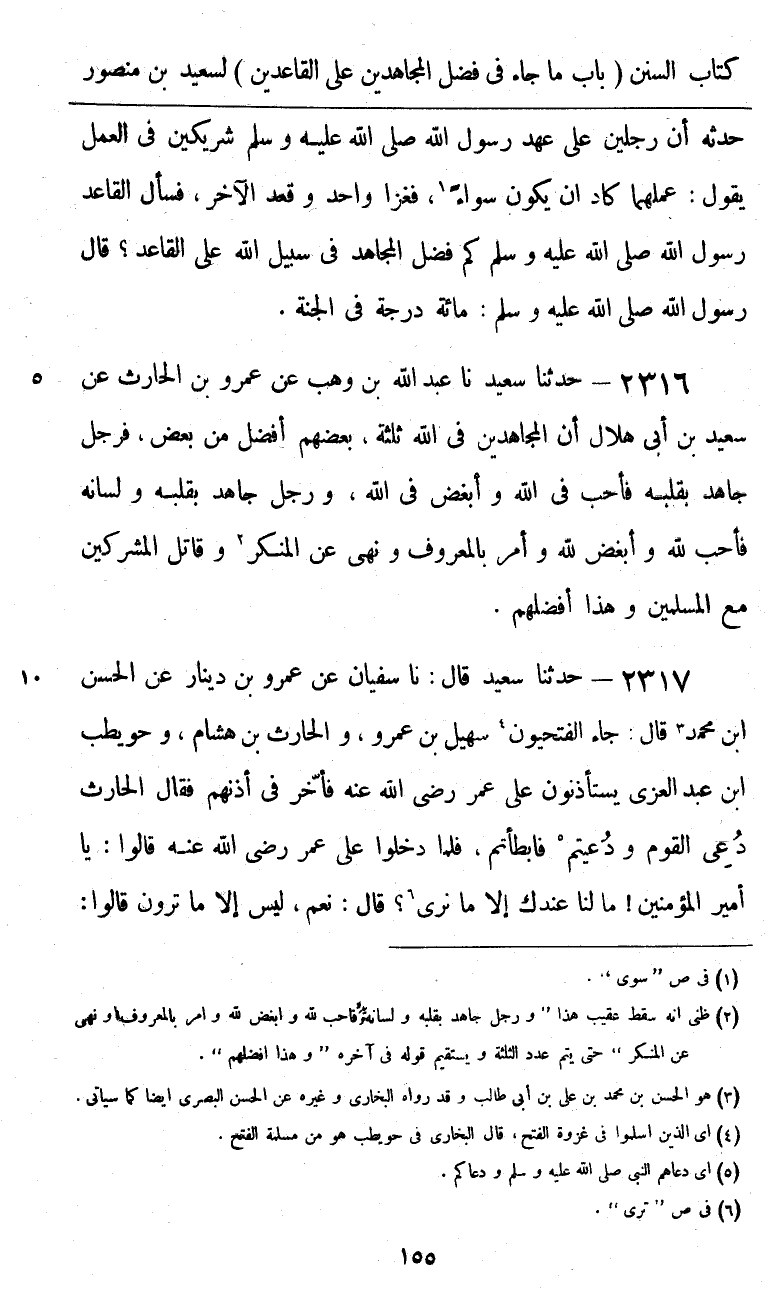 2317 - حَدَّثَنَا سَعِيدٌ قَالَ: نا سُفْيَانُ، عَنْ عَمْرِو بْنِ دِينَارٍ، عَنِ الْحَسَنِ بْنِ مُحَمَّدٍ، قَالَ: جَاءَ الْفَتْحِيُّونَ سُهَيْلُ بْنُ عَمْرٍو، وَالْحَارِثُ بْنُ هِشَامٍ، وَحُوَيْطِبُ بْنُ عَبْدِ الْعُزَّى يَسْتَأْذِنُونَ عَلَى عُمَرَ رَضِيَ اللَّهُ عَنْهُ فَأَخَّرَ فِي إِذْنِهِمْ، فَقَالَ الْحَارِثُ: §دُعِيَ الْقَوْمُ وَدُعِيتُمْ فَأَبْطَأْتُمْ، فَلَمَّا دَخَلُوا عَلَى عُمَرَ رَضِيَ اللَّهُ عَنْهُ قَالُوا: يَا أَمِيرَ الْمُؤْمِنِينَ مَا لَنَا عِنْدَكَ إِلَّا مَا نَرَى؟ قَالَ: «نَعَمْ، لَيْسَ إِلَّا مَا تَرَوْنَ» قَالُوا -[156]-: فَإِنَّا نَطْلُبُ مَا هُوَ أَرْفَعُ مِنْ هَذَا. فَغَزَوْا فِي سَبِيلِ اللَّهِ حَتَّى مَاتُوا