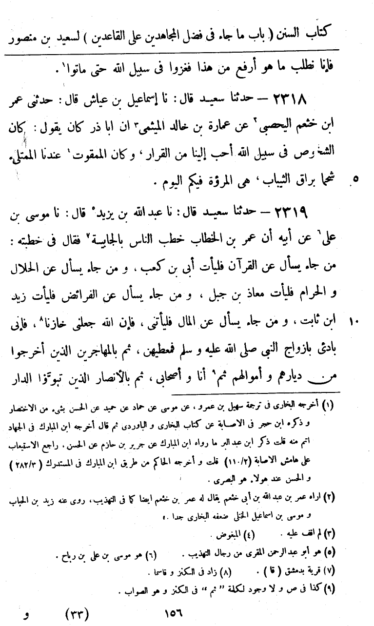 2318 - حَدَّثَنَا سَعِيدٌ قَالَ: نا إِسْمَاعِيلُ بْنُ عَيَّاشٍ، قَالَ: حَدَّثَنِي عُمَرُ بْنُ جُعْثُمٍ الْيَحْصِبِيُّ، عَنْ عُمَارَةَ بْنِ خَالِدٍ الْمَيْثَمِيِّ، أَنَّ أَبَا ذَرٍّ كَانَ يَقُولُ: كَانَ §الشُّخُوصُ فِي سَبِيلِ اللَّهِ أَحَبَّ إِلَيْنَا مِنَ الْقَرَارِ، وَكَانَ الْمَمْقُوتَ عِنْدَنَا الْمُمْتَلِئُ شَحْمًا بَرَّاقُ الثِّيَابِ، هِيَ الْمُرُوءَةُ فِيكُمُ الْيَوْمَ "