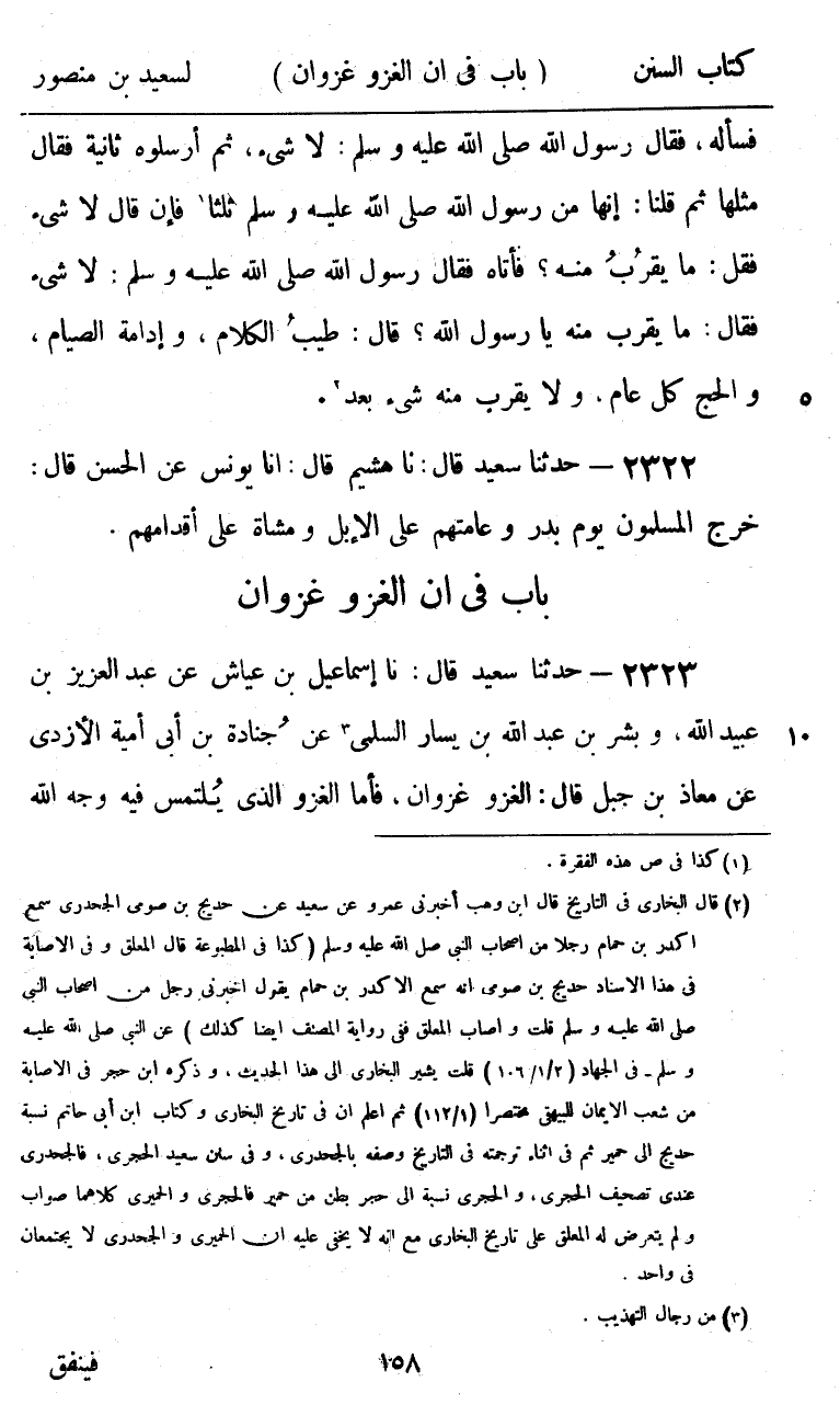 2322 - حَدَّثَنَا سَعِيدٌ قَالَ: نا هُشَيْمٌ، قَالَ: أنا يُونُسُ، عَنِ الْحَسَنِ، قَالَ: «§خَرَجَ الْمُسْلِمُونَ يَوْمَ بَدْرٍ وَعَامَّتُهُمْ عَلَى الْإِبِلِ وَمُشَاةً عَلَى أَقْدَامِهِمْ»