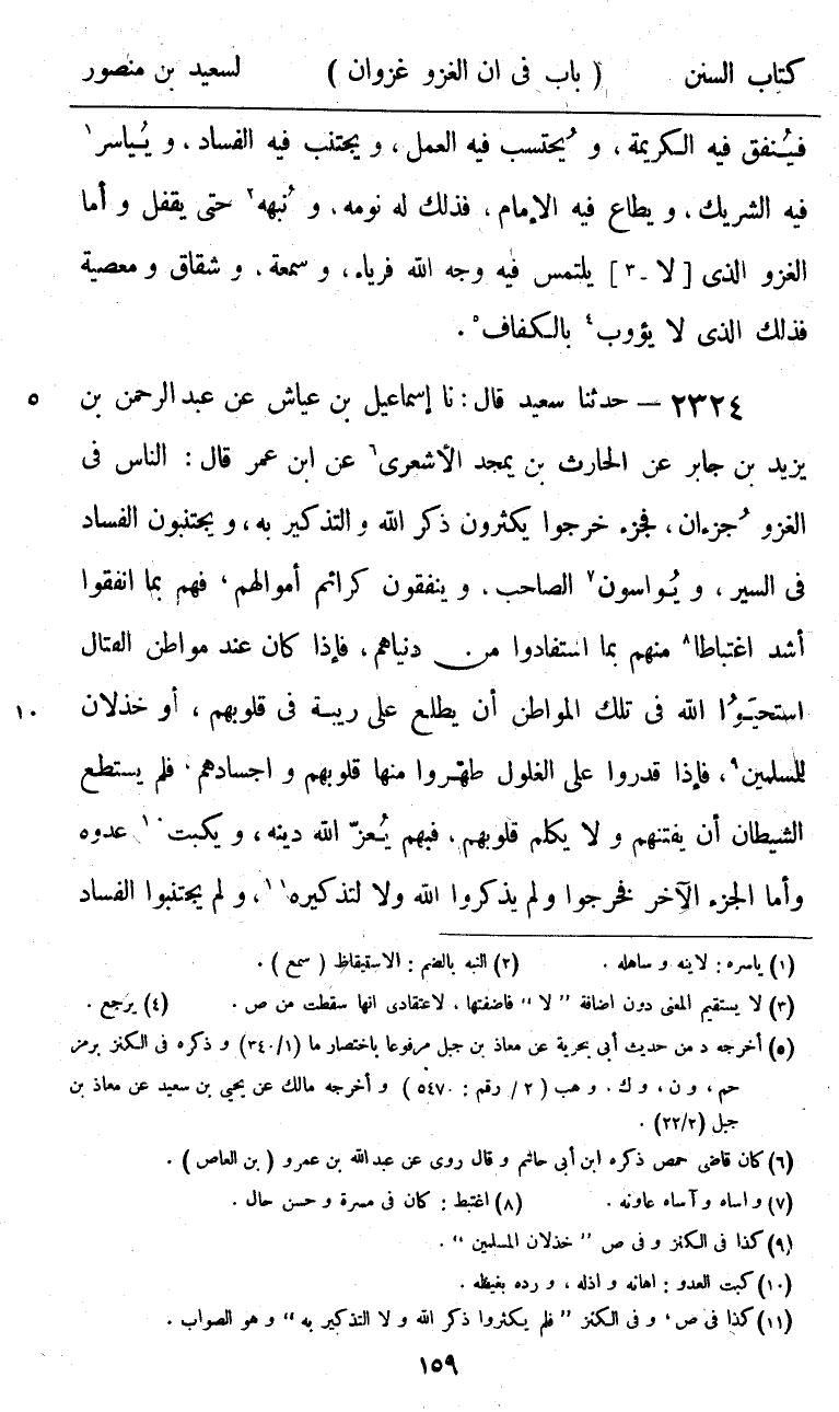2324 - حَدَّثَنَا سَعِيدٌ قَالَ: نا إِسْمَاعِيلُ بْنُ عَيَّاشٍ، عَنْ عَبْدِ الرَّحْمَنِ بْنِ يَزِيدَ بْنِ جَابِرٍ، عَنِ الْحَارِثِ بْنِ يَمْجُدَ الْأَشْعَرِيِّ، عَنِ ابْنِ عُمَرَ، قَالَ: «§لِلنَّاسِ فِي الْغَزْوِ جُزْءَانِ، فَجُزْءٌ خَرَجُوا يُكْثِرُونَ ذِكْرَ اللَّهِ وَالتَّذْكِيرَ بِهِ، وَيَجْتَنِبُونَ الْفَسَادَ فِي السَّيْرِ، وَيُوَاسُونَ الصَّاحِبَ، وَيُنْفِقُونَ كَرَائِمَ أَمْوَالِهِمْ، فَهُمْ بِمَا أَنْفَقُوا أَشَدُّ اغْتِبَاطًا مِنْهُمْ بِمَا اسْتَفَادُوا مِنْ دُنْيَاهُمْ، فَإِذَا كَانَ عِنْدَ مَوَاطِنِ الْقِتَالِ اسْتَحْيَوَا اللَّهَ فِي تِلْكَ الْمَوَاطِنِ أَنْ يَطَّلِعَ عَلَى رِيبَةٍ فِي قُلُوبِهِمْ، أَوْ خِذْلَانٍ لِلْمُسْلِمِينَ، فَإِذَا قَدَرُوا عَلَى الْغُلُولِ طَهَّرُوا مِنْهَا قُلُوبَهُمْ وَأَجْسَادَهُمْ، فَلَمْ يَسْتَطِعِ الشَّيْطَانُ أَنْ يَفْتِنَهُمْ وَلَا يَكْلَمَ قُلُوبَهُمْ، فَبِهِمْ يُعِزُّ اللَّهُ دِينَهُ، وَيَكْبِتُ عَدُوَّهُ، وَأَمَّا الْجُزْءُ الْآخَرُ فَخَرَجُوا، وَلَمْ يَذْكُرُوا اللَّهَ وَلَا لِتَذْكِيرِهِ، وَلَمْ يَجْتَنِبُوا الْفَسَادَ -[160]-، وَلَمْ يُوَاسُوا الصَّاحِبَ، وَلَمْ يُنْفِقُوا أَمْوَالَهُمْ إِلَّا وَهُمْ كَارِهُونَ، وَمَا أَنْفَقُوا مِنْ أَمْوَالِهِمْ رَأَوْهُ مَغْرَمًا، وَحَزَّنَهُمْ بِهِ الشَّيْطَانُ، فَإِذَا كَانَ عِنْدَ مَوَاطِنِ الْقِتَالِ كَانُوا مَعَ الْأَخِرِ الْأَخِرِ، الْخَاذِلِ الْخَاذِلِ، وَاعْتَصَمُوا بِرُءُوسِ الْجِبَالِ وَرُءُوسِ التِّلَالِ، فَإِذَا كَانَ لِلْمُسْلِمِينَ فَتْحٌ كَانُوا أَشَدَّهُمْ تَخَاطُبًا بِالْكَذِبِ، فَإِذَا قَدَرُوا عَلَى الْغُلُولِ اجْتَرَءُوا فِيهِ عَلَى اللَّهِ، وَحَدَّثَهُمُ الشَّيْطَانُ أَنَّهَا غَنِيمَةٌ، إِنْ أَصَابَهُمْ رَخَاءٌ بَطِرُوا، وَإِنْ أَصَابَهُمْ حَبْسٌ فَتَنَهُمُ الشَّيْطَانُ بِالْغَرَضِ، فَلَيْسَ لَهُمْ مِنْ أَجْرِ الْمُسْلِمِينَ شَيْءٌ غَيْرَ أَنَّ أَجْسَادَهُمْ مَعَ أَجْسَادِهِمْ، وَمَسِيرَهُمْ مَعَ مَسِيرِهِمْ، وَأَعْمَالُهُمْ وَنِيَّاتُهُمْ شَتَّى حَتَّى يَجْمَعَهُمُ اللَّهُ يَوْمَ الْقِيَامَةِ، ثُمَّ يُفَرِّقُ بَيْنَهُمْ»