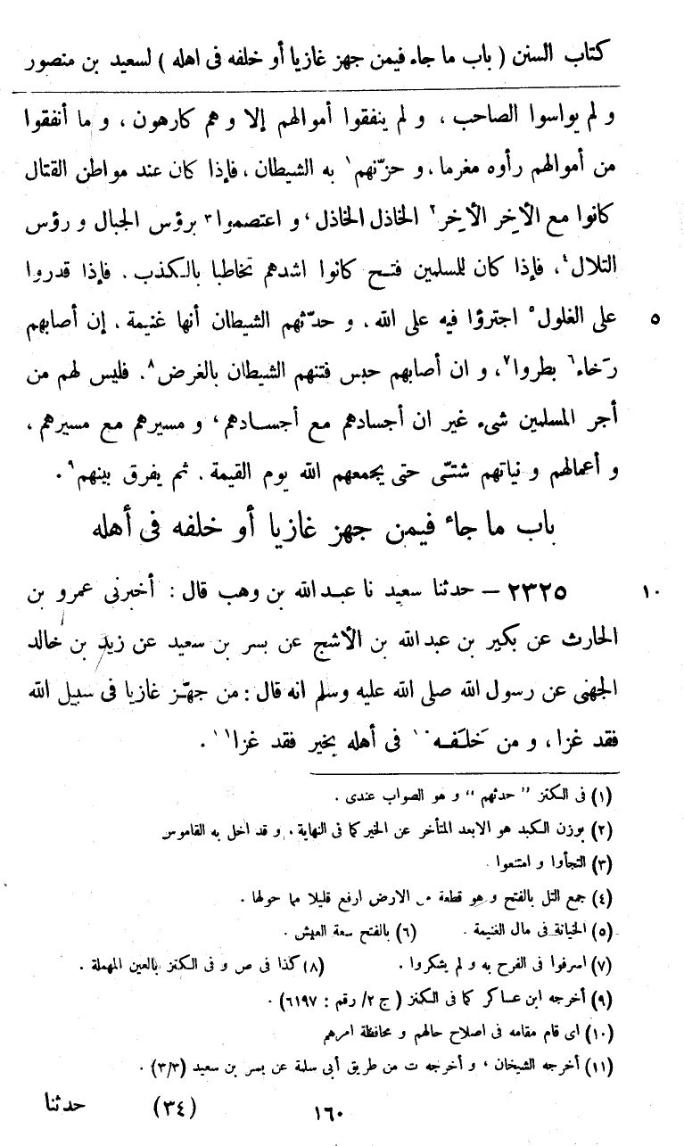2325 - حَدَّثَنَا سَعِيدٌ قَالَ: نا عَبْدُ اللَّهِ بْنُ وَهْبٍ، قَالَ: أَخْبَرَنِي عَمْرُو بْنُ الْحَارِثِ، عَنْ بُكَيْرِ بْنِ عَبْدِ اللَّهِ بْنِ الْأَشَجِّ، عَنْ بُسْرِ بْنِ سَعِيدٍ، عَنْ زَيْدِ بْنِ خَالِدٍ الْجُهَنِيِّ، عَنْ رَسُولِ اللَّهِ صَلَّى اللهُ عَلَيْهِ وَسَلَّمَ أَنَّهُ قَالَ: «§مَنْ جَهَّزَ غَازِيًا فِي سَبِيلِ اللَّهِ فَقَدْ غَزَا، وَمَنْ خَلَفَهُ فِي أَهْلِهِ بِخَيْرٍ فَقَدْ غَزَا»