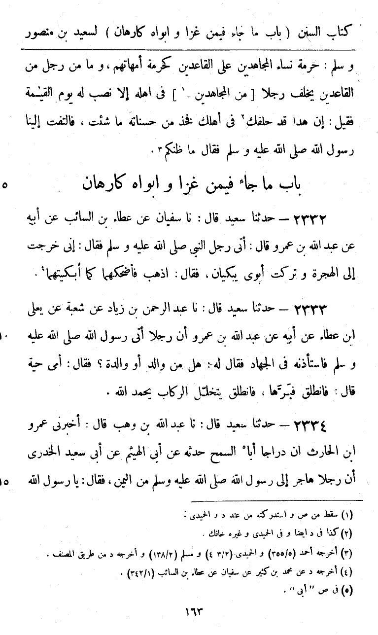 2332 - حَدَّثَنَا سَعِيدٌ قَالَ: نا سُفْيَانُ، عَنْ عَطَاءِ بْنِ السَّائِبِ، عَنْ أَبِيهِ، عَنْ عَبْدِ اللَّهِ بْنِ عَمْرٍو، قَالَ: أَتَى رَجُلٌ النَّبِيَّ صَلَّى اللهُ عَلَيْهِ وَسَلَّمَ فَقَالَ: إِنِّي خَرَجْتُ إِلَى الْهِجْرَةِ، وَتَرَكْتُ أَبَوَيَّ يَبْكِيَانِ، فَقَالَ: «§اذْهَبْ فَأَضْحِكْهُمَا كَمَا أَبْكَيْتَهُمَا»