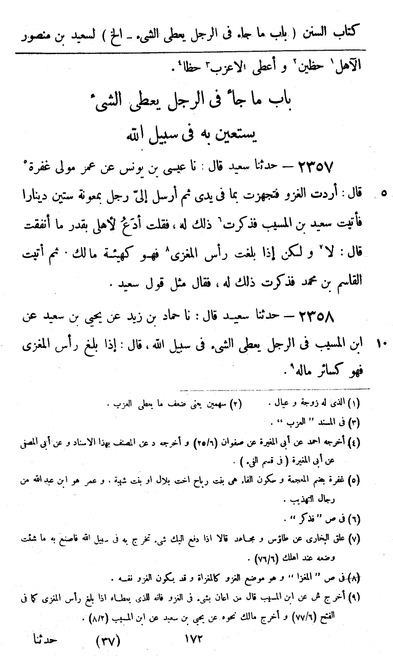2358 - حَدَّثَنَا سَعِيدٌ قَالَ: نا حَمَّادُ بْنُ زَيْدٍ، عَنْ يَحْيَى بْنِ سَعِيدٍ، عَنِ ابْنِ الْمُسَيِّبِ، فِي §الرَّجُلِ يُعْطَى الشَّيْءَ فِي سَبِيلِ اللَّهِ قَالَ: «إِذَا بَلَغَ رَأْسَ الْمَغْزَى فَهُوَ كَسَائِرِ مَالِهِ»