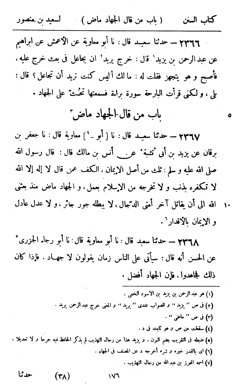 2366 - حَدَّثَنَا سَعِيدٌ قَالَ: نا أَبُو مُعَاوِيَةَ، عَنِ الْأَعْمَشِ، عَنْ إِبْرَاهِيمَ، عَنْ عَبْدِ الرَّحْمَنِ بْنِ يَزِيدَ، قَالَ: خَرَجَ يُرِيدُ أَنْ يُجَاعِلَ فِي بَعْثٍ خَرَجَ عَلَيْهِ، فَأَصْبَحَ وَهُوَ يَتَجَهَّزُ فَقُلْتُ لَهُ: مَا لَكَ؟ أَلَيْسَ كُنْتَ تُرِيدُ أَنْ تُجَاعِلَ؟ قَالَ: «بَلَى، وَلَكِنِّي §قَرَأْتُ الْبَارِحَةَ سُورَةَ بَرَاءَةَ فَسَمِعْتُهَا تَحُثُّ عَلَى الْجِهَادِ»