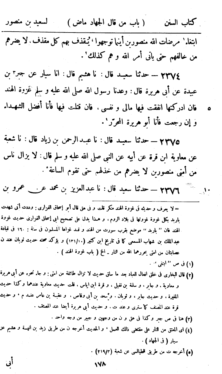 2374 - حَدَّثَنَا سَعِيدٌ قَالَ: نا هُشَيْمٌ، قَالَ: أنا سَيَّارٌ، عَنْ جَبْرِ بْنِ عُبَيْدَةَ، عَنْ أَبِي هُرَيْرَةَ، قَالَ: «§وَعَدَنَا رَسُولُ اللَّهِ صَلَّى اللهُ عَلَيْهِ وَسَلَّمَ غَزْوَةَ الْهِنْدِ فَإِنْ أَدْرَكْتُهَا أَنْفَقْتُ فِيهَا مَالِي وَنَفْسِي، فَإِنْ قُتِلْتُ فِيهَا فَأَنَا أَفْضَلُ الشُّهَدَاءِ، وَإِنْ رَجَعْتُ فَأَنَا أَبُو هُرَيْرَةَ الْمُحَرَّرُ»