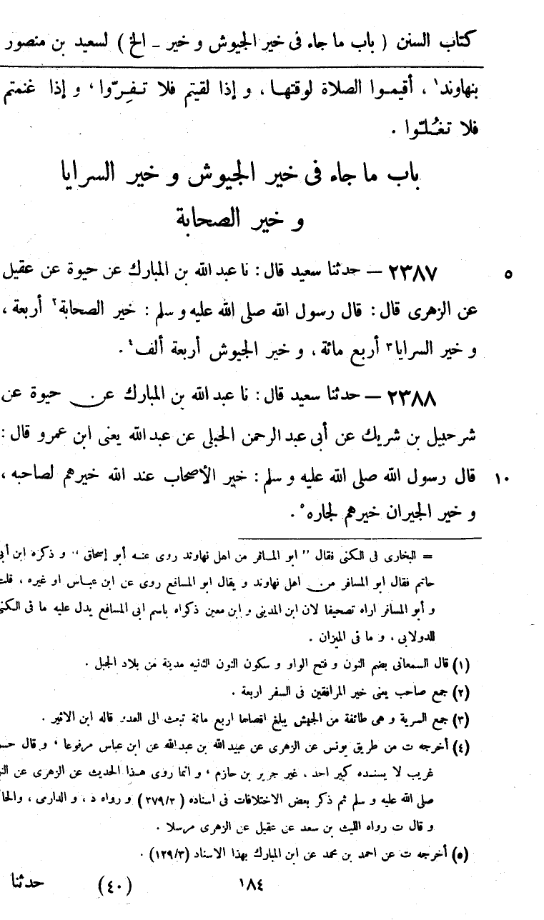 2387 - حَدَّثَنَا سَعِيدٌ قَالَ: نا عَبْدُ اللَّهِ بْنُ الْمُبَارَكِ، عَنْ حَيْوَةَ، عَنْ عُقَيْلٍ، عَنِ الزُّهْرِيِّ، قَالَ: قَالَ رَسُولُ اللَّهِ صَلَّى اللهُ عَلَيْهِ وَسَلَّمَ: «§خَيْرُ الصَّحَابَةِ أَرْبَعَةٌ، وَخَيْرُ السَّرَايَا أَرْبَعُ مِائَةٍ، وَخَيْرُ الْجُيُوشِ أَرْبَعَةُ آلَافٍ»
