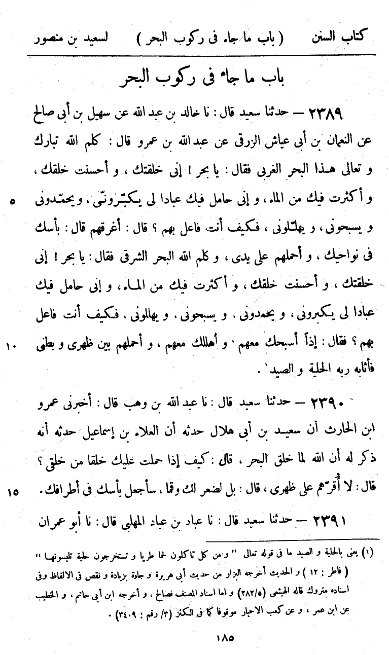 2389 - حَدَّثَنَا سَعِيدٌ قَالَ: نا خَالِدُ بْنُ عَبْدِ اللَّهِ، عَنْ سُهَيْلِ بْنِ أَبِي صَالِحٍ، عَنِ النُّعْمَانِ بْنِ أَبِي عَيَّاشٍ الزُّرَقِيِّ، عَنْ عَبْدِ اللَّهِ بْنِ عَمْرٍو، قَالَ: " §كَلَّمَ اللَّهُ تَبَارَكَ وَتَعَالَى هَذَا الْبَحْرَ الْغَرْبِيَّ فَقَالَ: «يَا بَحْرُ إِنِّي خَلَقْتُكَ، وَأَحْسَنْتُ خَلْقَكَ، وَأَكْثَرْتُ فِيكَ مِنَ الْمَاءِ، وَإِنِّي حَامِلٌ فِيكَ عِبَادًا لِي يُكَبِّرُونِي، وَيَحْمَدُونِي، وَيُسَبِّحُونِي، وَيُهَلِّلُونِي، فَكَيْفَ أَنْتَ فَاعِلٌ بِهِمْ؟» قَالَ: أُغْرِقُهُمْ، قَالَ: «بَأْسُكَ فِي نَوَاحِيكَ، وَأَحْمِلُهُمْ عَلَى يَدَيَّ» وَكَلَّمَ اللَّهُ الْبَحْرَ الشَّرْقِيَّ، فَقَالَ: " يَا بَحْرُ إِنِّي خَلَقْتُكَ، وَأَحْسَنْتُ خَلْقَكَ، وَأَكْثَرْتُ فِيكَ مِنَ الْمَاءِ، وَإِنِّي حَامِلٌ فِيكَ عِبَادًا لِي يُكَبِّرُونِي، وَيَحْمَدُونِي، وَيُسَبِّحُونِي، وَيُهَلِّلُونِي، فَكَيْفَ أَنْتَ فَاعِلٌ بِهِمْ؟ فَقَالَ: إِذًا أُسَبِّحُكَ مَعَهُمْ، وَأُهَلِّلُكَ مَعَهُمْ، وَأَحْمِلُهُمْ بَيْنَ ظَهْرِي وَبَطْنِي , فَأَثَابَهُ رَبُّهُ الْحِلْيَةَ وَالصَّيْدَ "