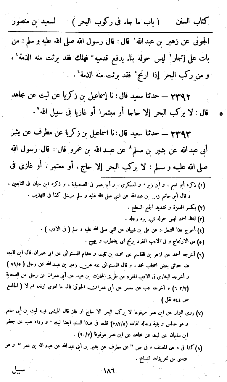 2392 - حَدَّثَنَا سَعِيدٌ قَالَ: نا إِسْمَاعِيلُ بْنُ زَكَرِيَّا، عَنْ لَيْثٍ، عَنْ مُجَاهِدٍ، قَالَ: «§لَا يَرْكَبُ الْبَحْرَ إِلَّا حَاجٌّ أَوْ مُعْتَمِرٌ أَوْ غَازٍ فِي سَبِيلِ اللَّهِ»