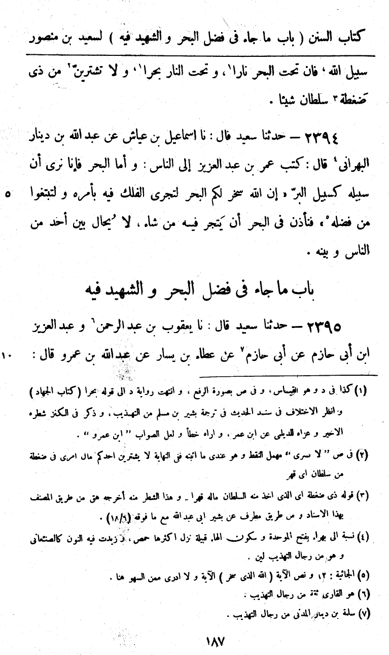 2394 - حَدَّثَنَا سَعِيدٌ قَالَ: نا إِسْمَاعِيلُ بْنُ عَيَّاشٍ، عَنْ عَبْدِ اللَّهِ بْنِ دِينَارٍ الْبَهْرَانِيِّ، قَالَ: كَتَبَ عُمَرُ بْنُ عَبْدِ الْعَزِيزِ إِلَى النَّاسِ: «وَأَمَّا §الْبَحْرُ فَإِنَّا نَرَى أَنَّ سَبِيلَهُ كَسَبِيلِ الْبَرِّ» إِنَّ اللَّهَ سَخَّرَ لَكُمُ الْبَحْرَ لِتَجْرِيَ الْفُلْكُ فِيهِ بِأَمْرِهِ وَلِتَبْتَغُوا مِنْ فَضْلِهِ «فَنَأْذَنُ فِي الْبَحْرِ أَنْ يَتَّجِرَ فِيهِ مَنْ شَاءَ، لَا يُحَالُ بَيْنَ أَحَدٍ مِنَ النَّاسِ وَبَيْنَهُ»