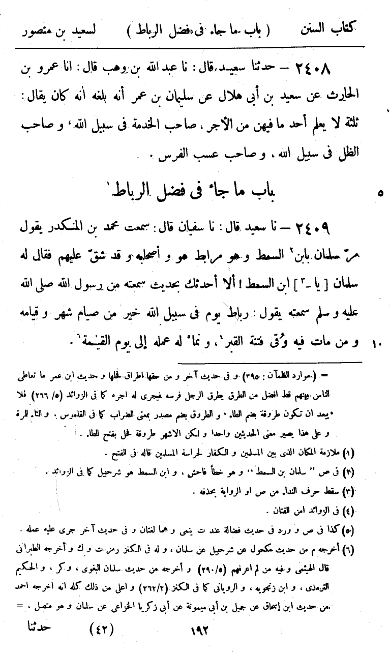 2409 - حَدَّثَنَا سَعِيدٌ قَالَ: نا سُفْيَانُ، قَالَ: سَمِعْتُ مُحَمَّدَ بْنَ الْمُنْكَدِرِ، يَقُولُ: مَرَّ سَلْمَانُ بِابْنِ السِّمْطِ وَهُوَ مُرَابِطٌ هُوَ وَأَصْحَابُهُ، وَقَدْ شَقَّ عَلَيْهِمْ، فَقَالَ لَهُ سَلْمَانُ يَا ابْنَ السِّمْطِ أَلَا أُحَدِّثُكَ بِحَدِيثٍ سَمِعْتُهُ مِنْ رَسُولِ اللَّهِ صَلَّى اللهُ عَلَيْهِ وَسَلَّمَ سَمِعْتُهُ يَقُولُ: «§رِبَاطُ يَوْمٍ فِي سَبِيلِ اللَّهِ خَيْرٌ مِنْ صِيَامِ شَهْرٍ وَقِيَامِهِ، وَمَنْ مَاتَ فِيهِ وُقِيَ فِتْنَةَ الْقَبْرِ، وَنَمَا لَهُ عَمَلٌ إِلَى يَوْمِ الْقِيَامَةِ»