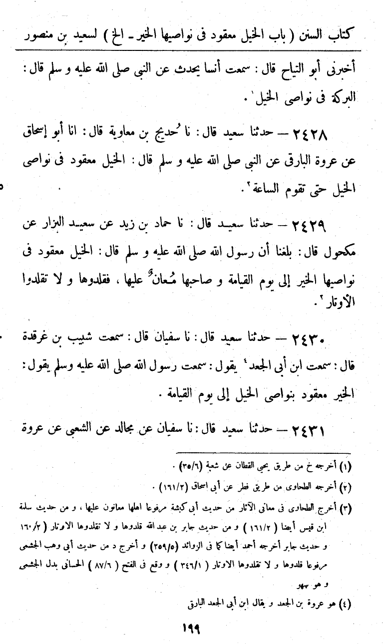 2428 - حَدَّثَنَا سَعِيدٌ قَالَ: نا حُدَيْجُ بْنُ مُعَاوِيَةَ، قَالَ: أنا أَبُو إِسْحَاقَ، عَنْ عُرْوَةَ الْبَارِقِيِّ، عَنِ النَّبِيِّ صَلَّى اللهُ عَلَيْهِ وَسَلَّمَ قَالَ: «§الْخَيْرُ مَعْقُودٌ فِي نَوَاصِي الْخَيْلِ حَتَّى تَقُومَ السَّاعَةُ»