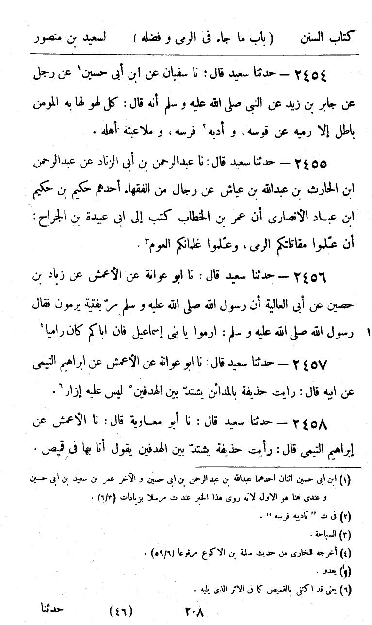 2455 - حَدَّثَنَا سَعِيدٌ قَالَ: نا عَبْدُ الرَّحْمَنِ بْنُ أَبِي الزِّنَادِ، عَنْ عَبْدِ الرَّحْمَنِ بْنِ الْحَارِثِ بْنِ عَبْدِ اللَّهِ بْنِ عَيَّاشٍ، عَنْ رِجَالٍ مِنَ الْفُقَهَاءِ أَحَدُهُمْ حَكِيمُ بْنُ حَكِيمِ بْنِ عَبَّادٍ الْأَنْصَارِيُّ أَنَّ عُمَرَ بْنَ الْخَطَّابِ، كَتَبَ إِلَى أَبِي عُبَيْدَةَ بْنِ الْجَرَّاحِ: «أَنْ §عَلِّمُوا، مُقَاتِلَتَكُمُ الرَّمْيَ، وَعَلِّمُوا غِلْمَانَكُمُ الْعَوْمَ»