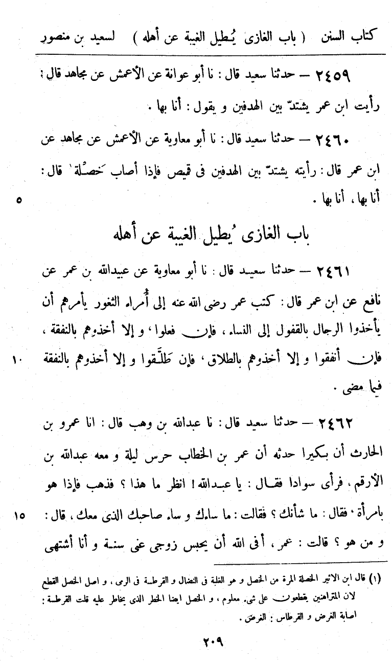 2462 - حَدَّثَنَا سَعِيدٌ قَالَ: نا عَبْدُ اللَّهِ بْنُ وَهْبٍ، قَالَ: أنا عَمْرُو بْنُ الْحَارِثِ، أَنَّ بُكَيْرًا، حَدَّثَهُ أَنَّ §عُمَرَ بْنَ الْخَطَّابِ حَرَسَ لَيْلَةً وَمَعَهُ عَبْدُ اللَّهِ بْنُ الْأَرْقَمِ، فَرَأَى سَوَادًا، فَقَالَ: «يَا عَبْدَ اللَّهِ، انْظُرْ مَا هَذَا؟» فَذَهَبَ، فَإِذَا هُوَ بِامْرَأَةٍ، فَقَالَ: مَا شَأْنُكِ؟ فَقَالَتْ: مَا سَاءَكَ وَسَاءَ صَاحِبَكَ الَّذِي مَعَكَ؟ قَالَ: وَمَنْ هُوَ؟ قَالَتْ: عُمَرُ، أَفِي اللَّهِ أَنْ يُحْبَسَ زَوْجِي عَنِّي سَنَةً، وَأَنَا أَشْتَهِي -[210]- مَا تَشْتَهِي النِّسَاءُ؟ فَرَجَعَ إِلَى عُمَرَ، فَأَخْبَرَهُ، فَسَأَلَهَا: «أَيْنَ بَعْثُهُ؟» فَأَخْبَرَتْهُ، فَكَتَبَ إِلَيْهِ، فَأَقْدَمَهُ