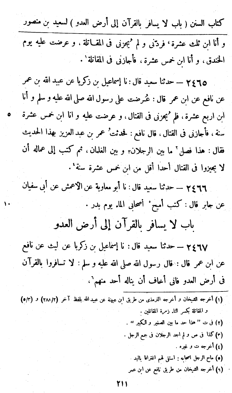 2465 - حَدَّثَنَا سَعِيدٌ قَالَ: نا إِسْمَاعِيلُ بْنُ زَكَرِيَّا، عَنْ عُبَيْدِ اللَّهِ بْنِ عُمَرَ، عَنْ نَافِعٍ، عَنِ ابْنِ عُمَرَ، قَالَ: «§عُرِضْتُ عَلَى رَسُولِ اللَّهِ صَلَّى اللهُ عَلَيْهِ وَسَلَّمَ وَأَنَا ابْنُ أَرْبَعَ عَشْرَةَ، فَلَمْ يُجِزْنِي فِي الْقِتَالِ، وَعُرِضْتُ عَلَيْهِ وَأَنَا ابْنُ خَمْسَ عَشْرَةَ سَنَةً، فَأَجَازَنِي فِي الْقِتَالِ» قَالَ نَافِعٌ: فَحَدَّثْتُ عُمَرَ بْنَ عَبْدِ الْعَزِيزِ بِهَذَا الْحَدِيثِ، فَقَالَ: هَذَا فَصْلُ مَا بَيْنَ الرِّجَالِ وَبَيْنَ الْغِلْمَانِ، ثُمَّ كَتَبَ إِلَى عُمَّالِهِ: أَنْ لَا يُجِيزُوا فِي الْقِتَالِ أَحَدًا أَقَلَّ مِنِ ابْنِ خَمْسَ عَشْرَةَ سَنَةً