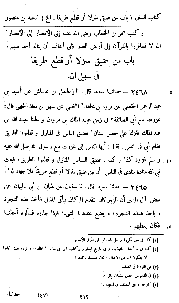 2468 - حَدَّثَنَا سَعِيدٌ قَالَ: نا إِسْمَاعِيلُ بْنُ عَيَّاشٍ، عَنْ أُسَيْدِ بْنِ عَبْدِ الرَّحْمَنِ الْخَثْعَمِيِّ، عَنْ فَرْوَةَ بْنِ مُجَاهِدٍ اللَّخْمِيِّ، عَنْ سَهْلِ بْنِ مُعَاذٍ الْجُهَنِيِّ، قَالَ: غَزَوْتُ مَعَ أَبِي الصَّائِفَةِ فِي زَمَنِ عَبْدِ الْمَلِكِ بْنِ مَرْوَانَ وَعَلَيْنَا عَبْدُ اللَّهِ بْنُ عَبْدِ الْمَلِكِ، فَنَزَلْنَا عَلَى حِصْنِ سِنَانٍ، فَضَيَّقَ النَّاسُ فِي الْمَنَازِلِ، وَقَطَعُوا الطَّرِيقَ، فَقَامَ أَبِي فِي النَّاسِ، فَقَالَ: أَيُّهَا النَّاسُ، إِنِّي غَزَوْتُ مَعَ رَسُولِ اللَّهِ صَلَّى اللهُ عَلَيْهِ وَسَلَّمَ غَزْوَةَ كَذَا وَكَذَا، فَضَيَّقَ النَّاسُ الْمَنَازِلَ، وَقَطَعُوا الطَّرِيقَ، فَبَعَثَ نَبِيُّ اللَّهِ مُنَادِيًا يُنَادِي فِي النَّاسِ: «أَنَّ §مَنْ ضَيَّقَ مَنْزِلًا أَوْ قَطَعَ طَرِيقًا فَلَا جِهَادَ لَهُ»