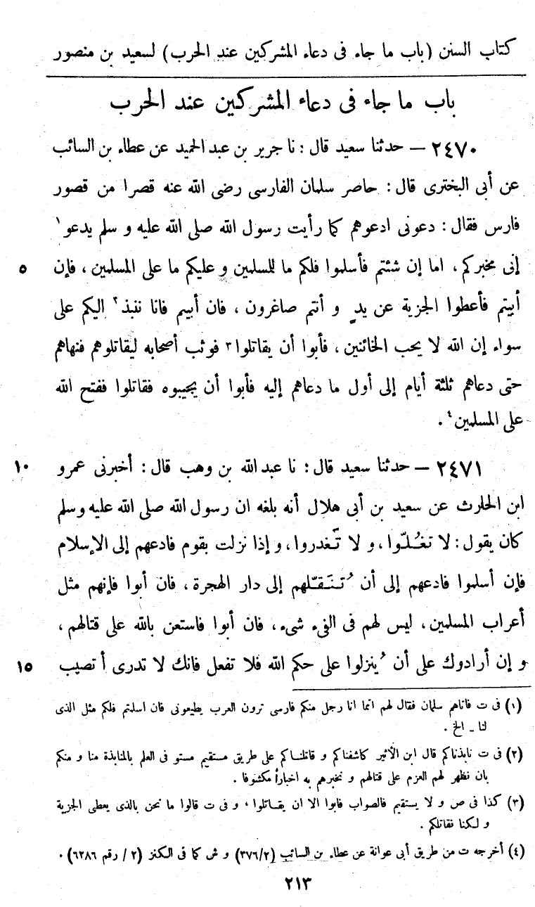 2470 - حَدَّثَنَا سَعِيدٌ قَالَ: نا جَرِيرُ بْنُ عَبْدِ الْحَمِيدِ، عَنْ عَطَاءِ بْنِ السَّائِبِ، عَنْ أَبِي الْبَخْتَرِيِّ، قَالَ: حَاصَرَ سَلْمَانُ الْفَارِسِيُّ رَضِيَ اللَّهُ عَنْهُ قَصْرًا مِنْ قُصُورِ فَارِسَ، فَقَالَ: دَعُونِي أَدْعُوهُمْ كَمَا رَأَيْتُ رَسُولُ اللَّهِ صَلَّى اللهُ عَلَيْهِ وَسَلَّمَ يَدْعُو إِنِّي مُخْبِرُكُمْ، أَمَا " §إِنْ شِئْتُمْ فَأَسْلِمُوا فَلَكُمْ مَا لِلْمُسْلِمِينَ وَعَلَيْكُمْ مَا عَلَى الْمُسْلِمِينَ، فَإِنْ أَبَيْتُمْ فَأَعْطُوا الْجِزْيَةَ عَنْ يَدٍ وَأَنْتُمْ صَاغِرُونَ، فَإِنْ أَبَيْتُمْ فَإِنَّا نَنْبِذُ إِلَيْكُمْ عَلَى سَوَاءٍ {إِنَّ اللَّهَ لَا يُحِبُّ الْخَائِنِينَ} [الأنفال: 58] " فَأَبَوْا إِلَّا أَنْ يُقَاتِلُوا، فَوَثَبَ أَصْحَابُهُ لِيُقَاتِلُوهُمْ، فَنَهَاهُمْ حَتَّى دَعَاهُمْ ثَلَاثَةَ أَيَّامٍ إِلَى أَوَّلِ مَا دَعَاهُمْ إِلَيْهِ، فَأَبَوْا أَنْ يُجِيبُوهُ، فَقَاتَلُوا، فَفَتَحَ اللَّهُ عَلَى الْمُسْلِمِينَ